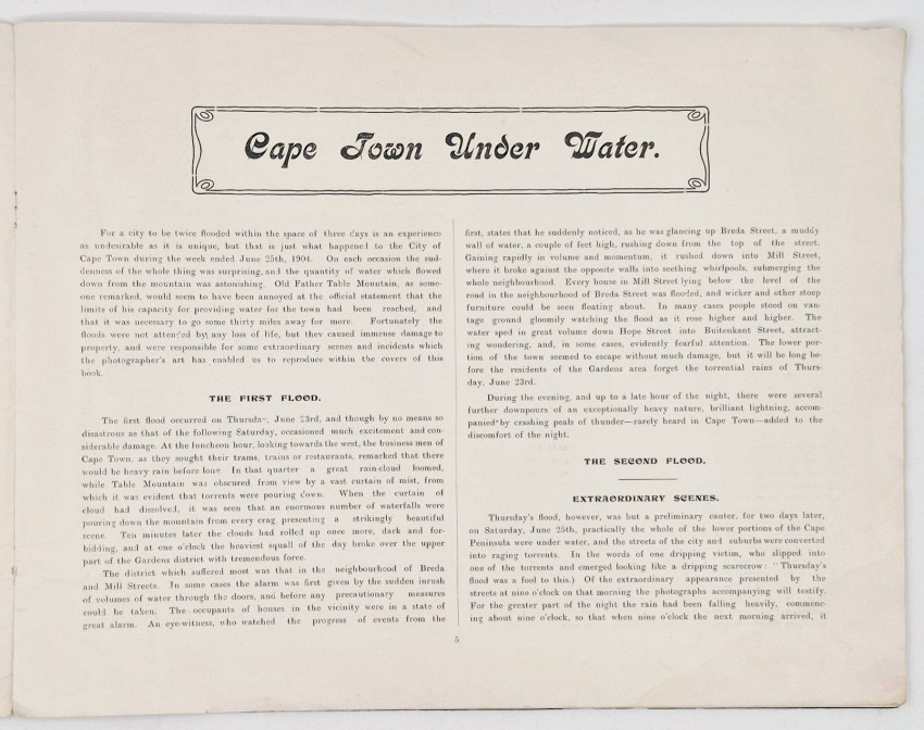 16 pages, 5 pages of text and numerous black & white photographs (the photographers are not identified other than being from the Cape Times and The Argus) , original printed light green card wrappers, a very good copy.