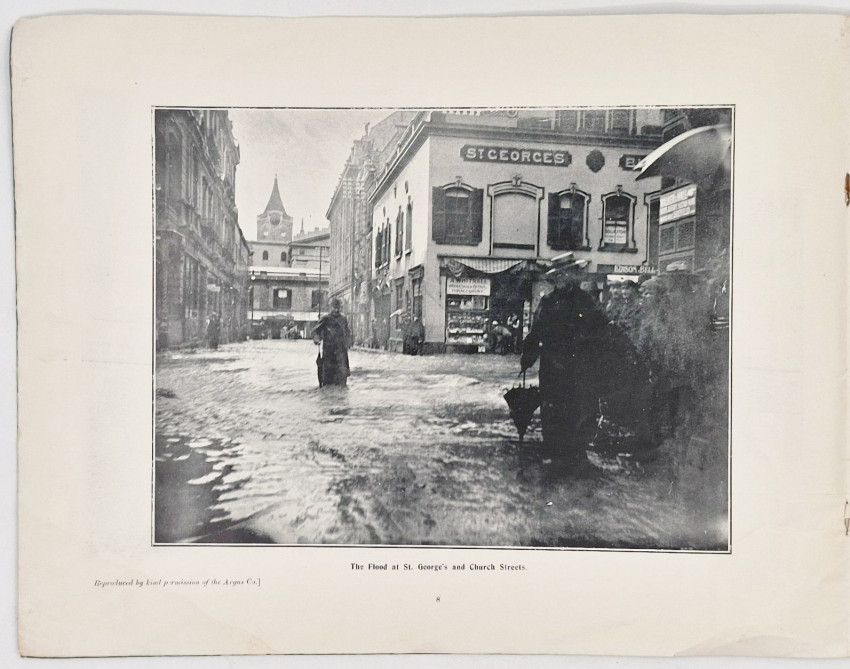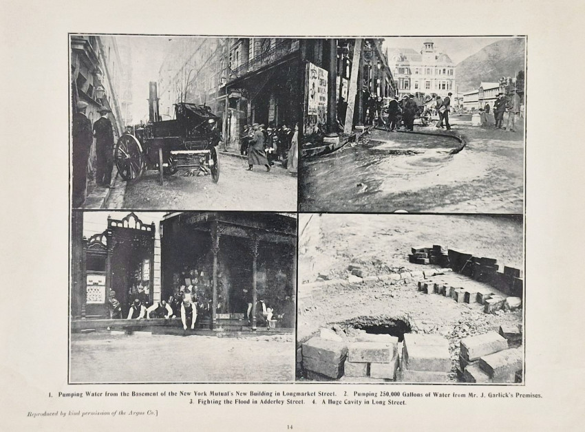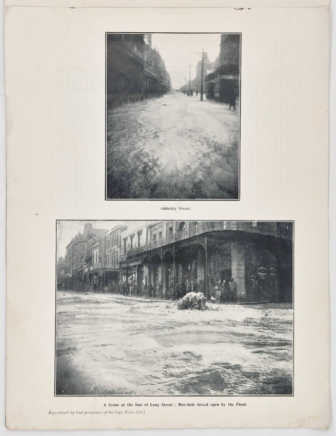 In late June 1904, Cape Town was battered by two massive North-Westerly gales in quick succession on the 23rd and 25th. The city’s drainage systems, still largely based on old Victorian infrastructure and the grachte (canals) that had been covered up, were completely overwhelmed. The storm turned major thoroughfares like Adderley Street and St. George’s Street into rushing rivers. cellars were flooded, foundations were undermined, and the newly reclaimed Foreshore area faced significant battering from the sea. The photographs show horse-drawn carriages struggling through deep water, shopkeepers standing outside flooded their flooded shops and damaged buildings and roads in the suburbs.