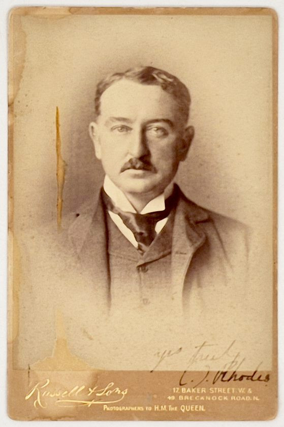 Photographic portrait mounted on stiff card, 177 x 109 mm, signed 'Yours truly, C.J. Rhodes' in the bottom right hand corner. Stain down the left hand side.