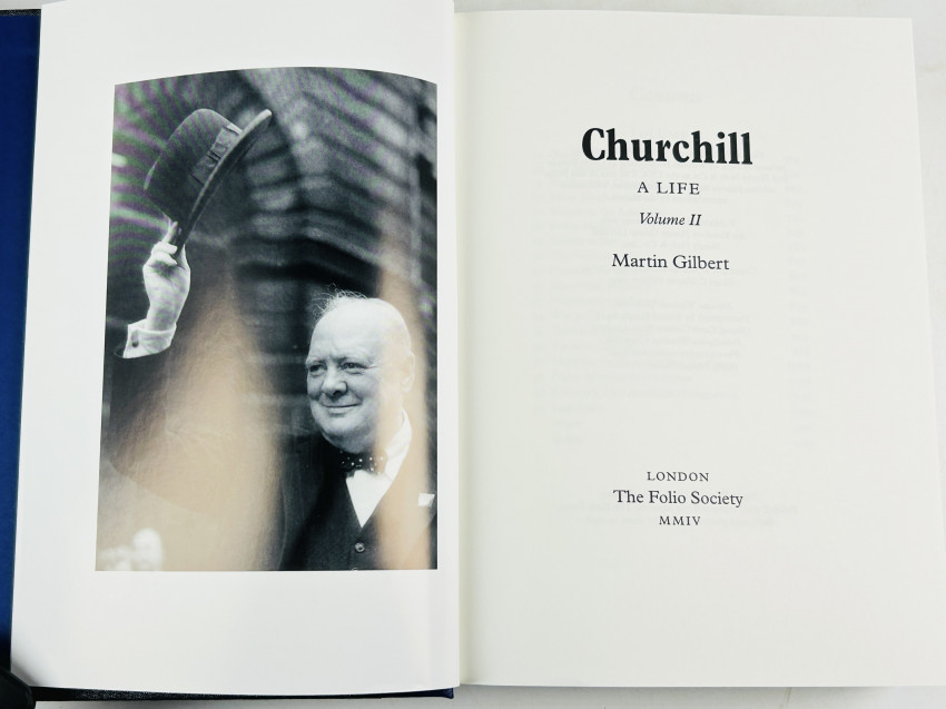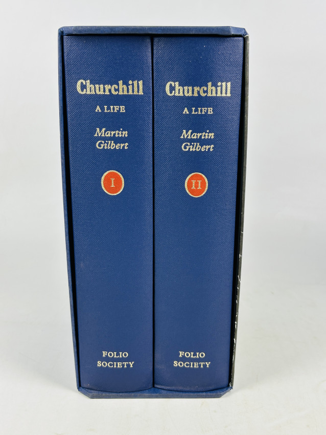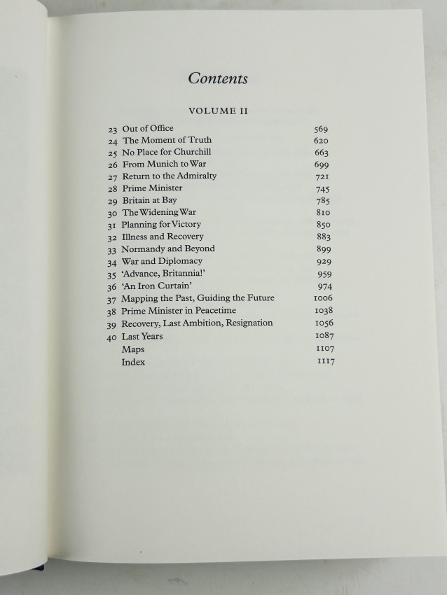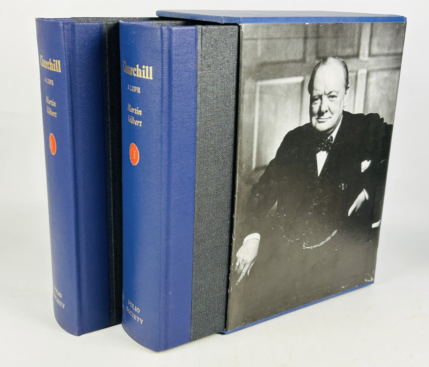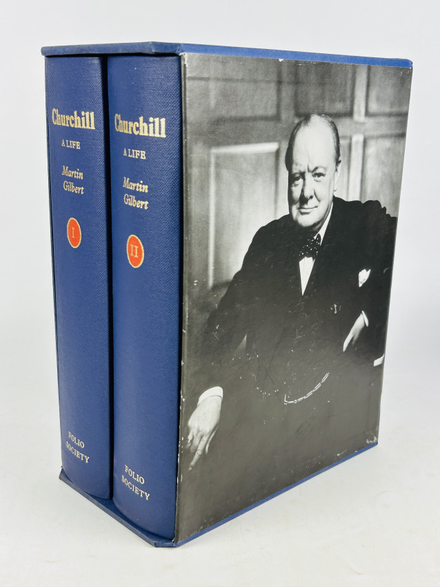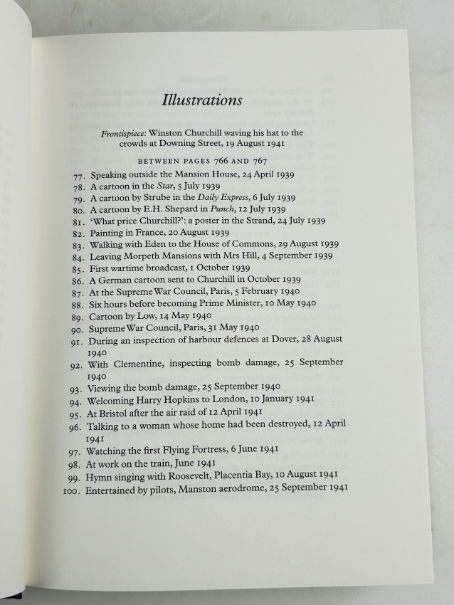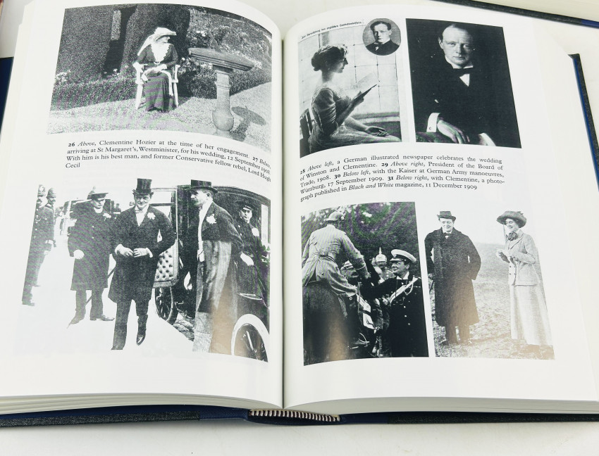 2 Hard cover volumes in dark blue cloth, housed in the original publisher's slip case which has a photograph of Sir Winston Churchill. Gilt writing in gold and red on the spines.
