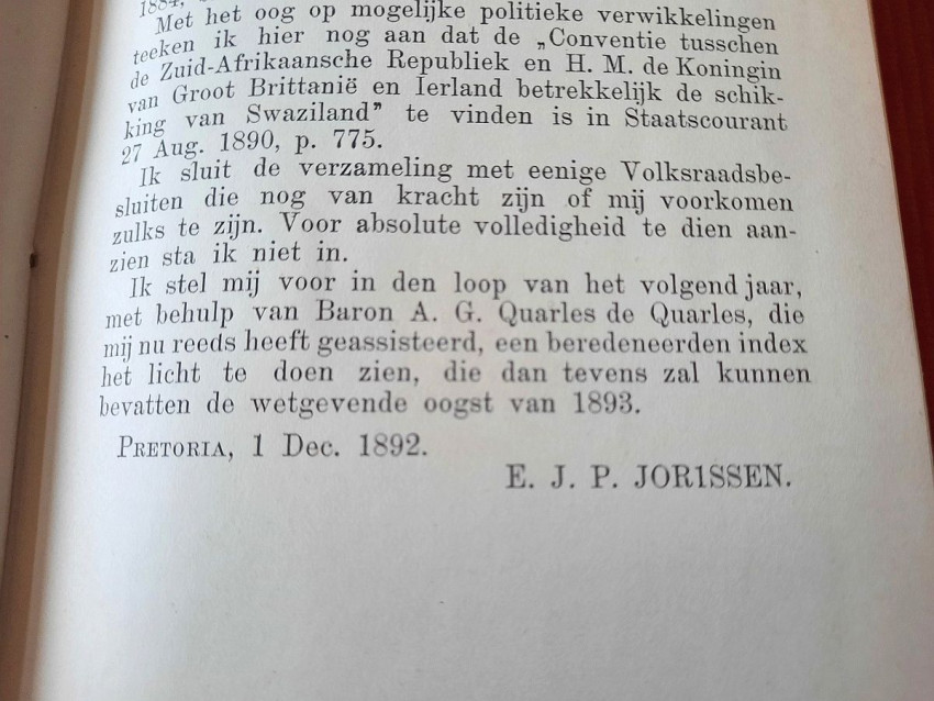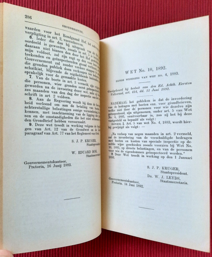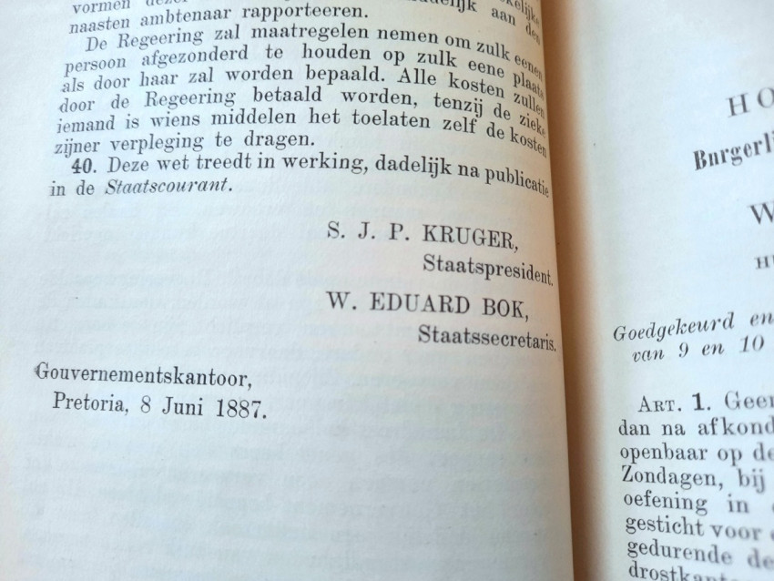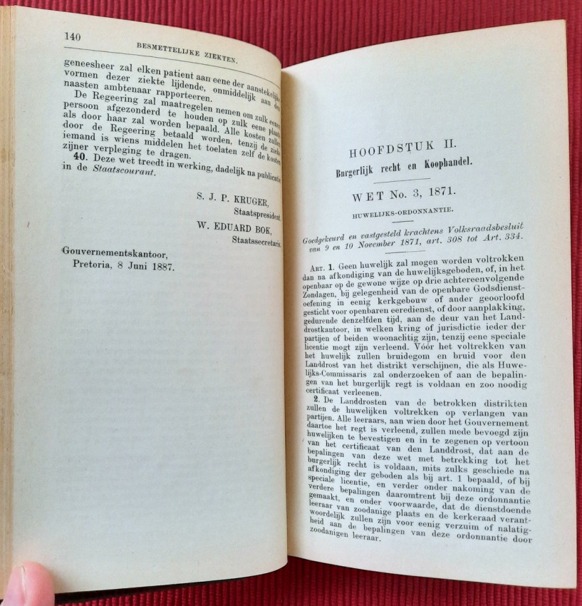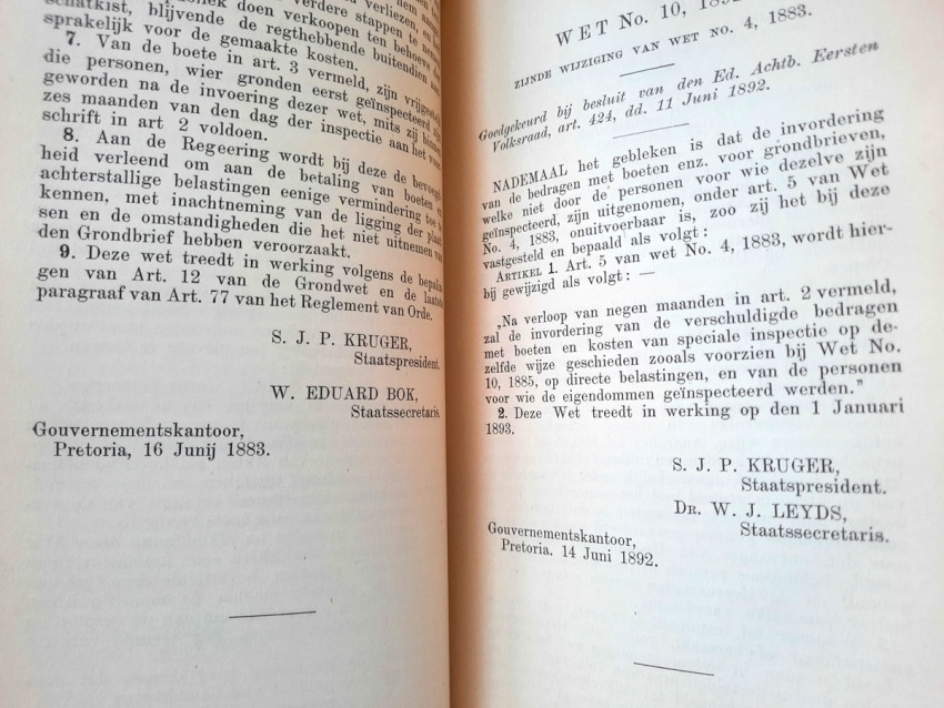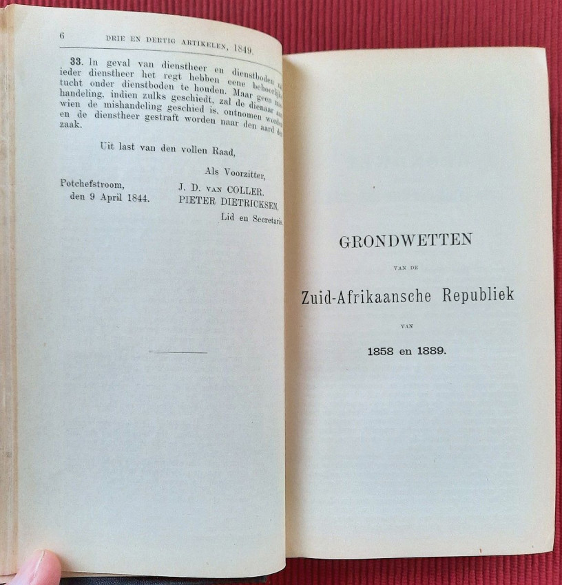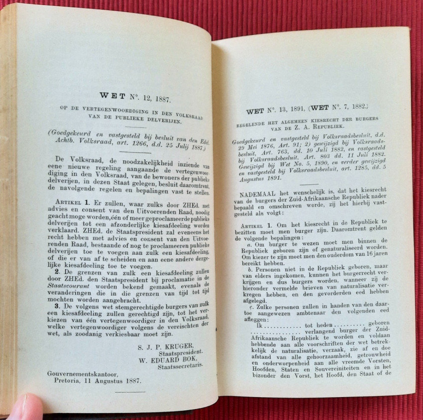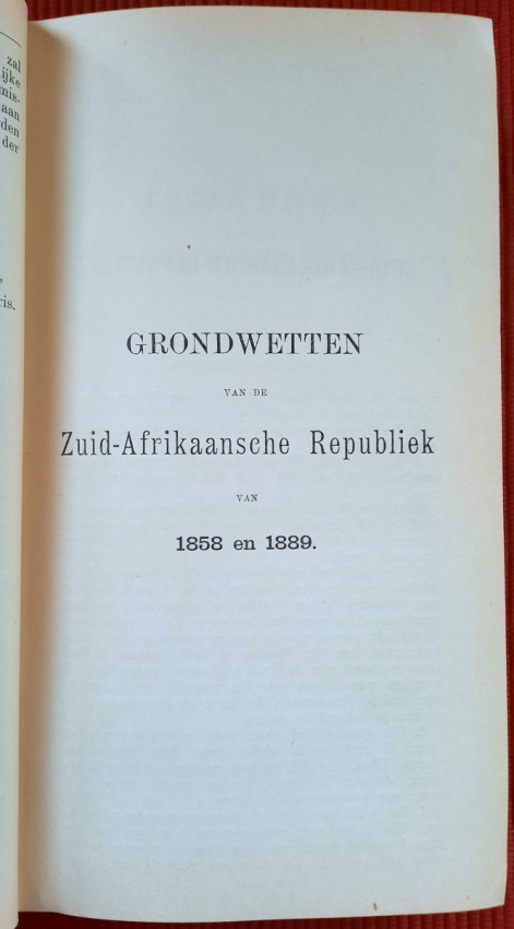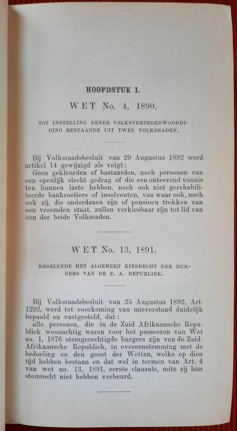 CHAPTER I. - Constitution and Other Laws of a Public Law Nature (contains: Thirty-three articles, 1849; Constitution 1858; Constitution 1889; Four attachments; Two People's Councils; Eligibility to vote as a member of the Volksraad; Representation of the Goldfields; Election law - a) Ex. Council Resolution, art. 360 dated 3 August 1891; b) Decree of the First People's Council, Article 825, dated July 18, 1892; Martial law; Dutch language; Travelers Act; Obstruction of public roads; Road maintenance; Law on locks; Infectious diseases);