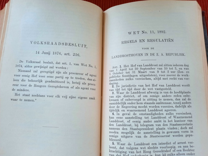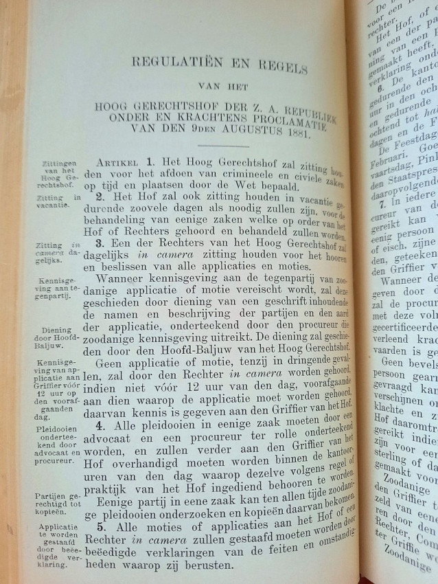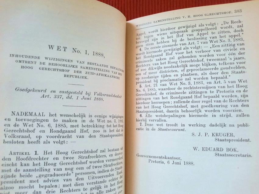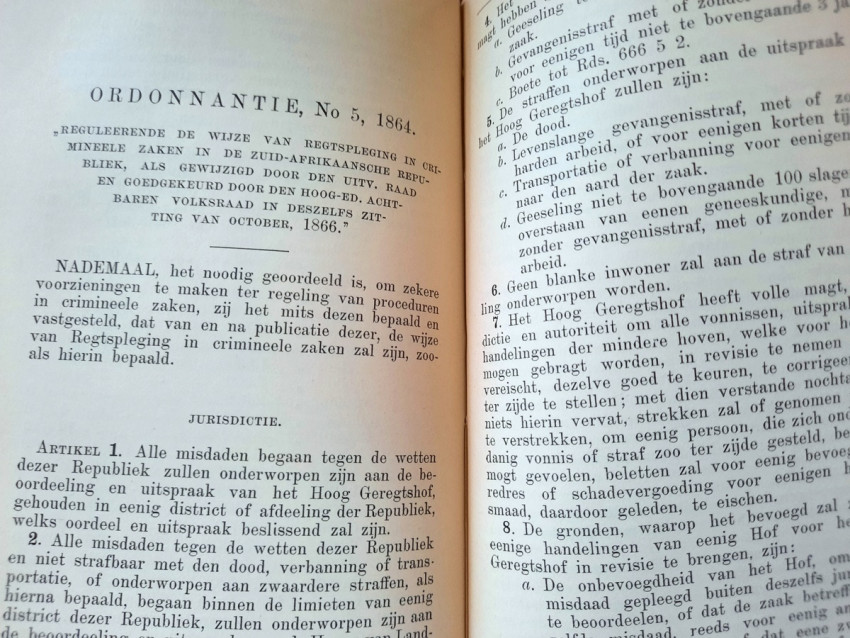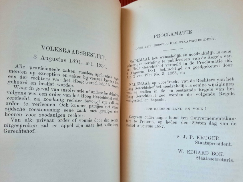 CHAPTER III. - Judiciary, the Courts of Appeal, the Public Prosecution Service, Procedures, Landdrosten, Justices of the Peace (contains: Proclamation concerning the establishment of the Supreme Court of Justice; Composition of the Supreme Court; Amendment of existing laws regarding courts of appeal; Amendment of the existing provisions regarding the composition of the Supreme Court; People's Council Decree of August 3, 1891, Article 1234; Regulations and Rules of the Supreme Court; Rate for the Higher Courts; Amendment of the tariffs for the Courts of Appeal; Travel and accommodation expenses for witnesses in criminal cases; Instructions for the Bailiff; Instructions for the Master of the High Court; Ordinance on the administration of justice in criminal cases; Instructions for the State Attorney and the Public Prosecutors; Method of proceeding before the Courts of Appeal of Landdrosten and of Landdrosten and Heemraden; Rules and regulations for the Landdrost-Hoven; Instructions for field cornets and assistant field cornets; Justices of the Peace; The appearance of witnesses in the courts of the Orange Free State; Ditto in the courts of Zululand; Providing documents from public offices; Summons of members of the People's Council; Collection of small debts; Sale of goods in execution pursuant to a judgment of the Court of the Landdrost; Hostage situation; Extradition Act);