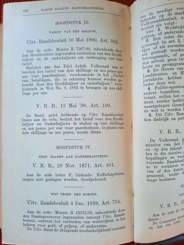 CHAPTER VII. - People's Council Decisions (contains: CHAPTER I. - Public holidays; Abolition of ministers' salaries, Amendment XXXIII articles; Penal provision in the Electoral Act; Racing on Sunday; Village regulations; Ban on relinquishing village land; People's Councils; CHAPTER II. - Age of consent; Foreign service contracts; Distance of minerals by notarial contract; CHAPTER III. - Bailiff's rate; CHAPTER IV. - No beatings for Kaffir captains. Law against boxing; CHAPTER V. - Licensed in clubs; CHAPTER VI. - Law Arabs, etc.; Alphabetical list of laws not included; Index).