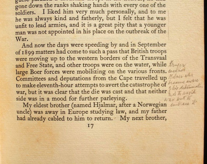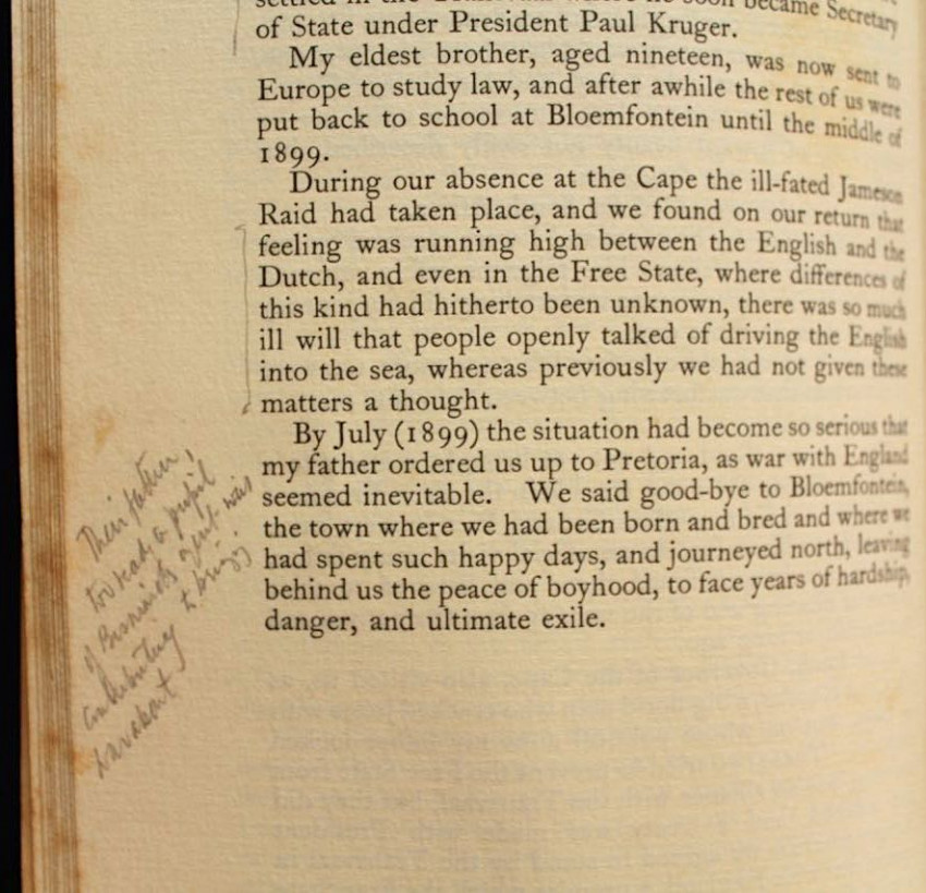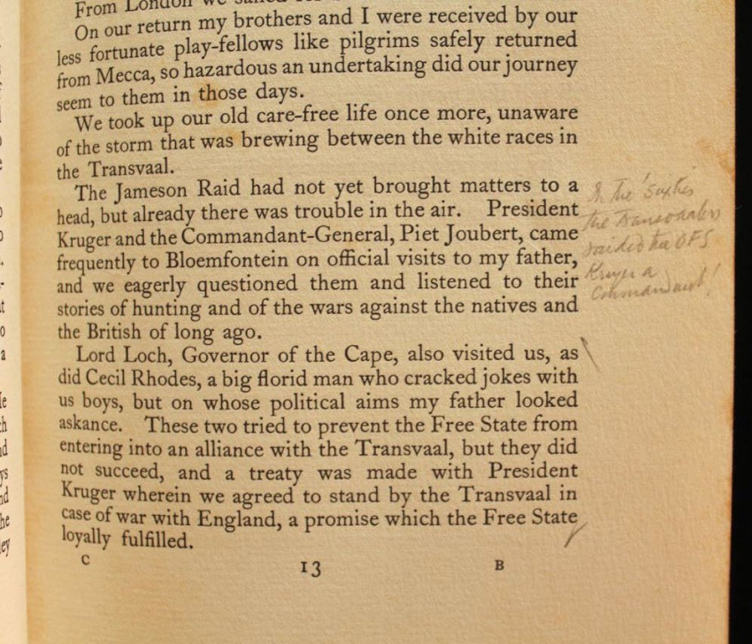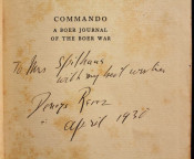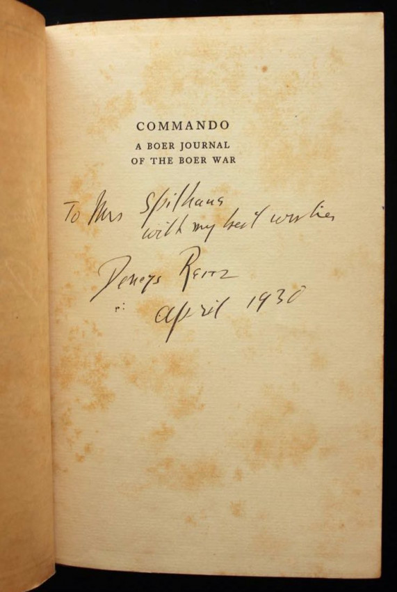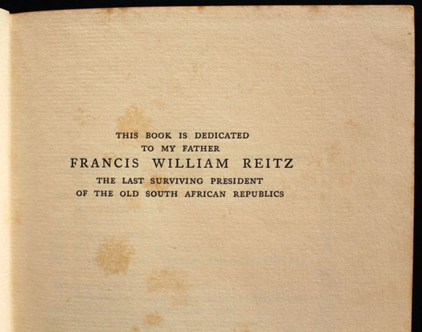 Reitz inscribed this copy to Margaret Whiting Spilhaus (1889-1981), author of books on numerous subjects ranging from geography, genealogy, botany to children's literature, but mainly South African history. Apart from writing she was also a book illustrator and cartographer known for a series of 5 large-format pictorial maps published between 1927 - 1943.