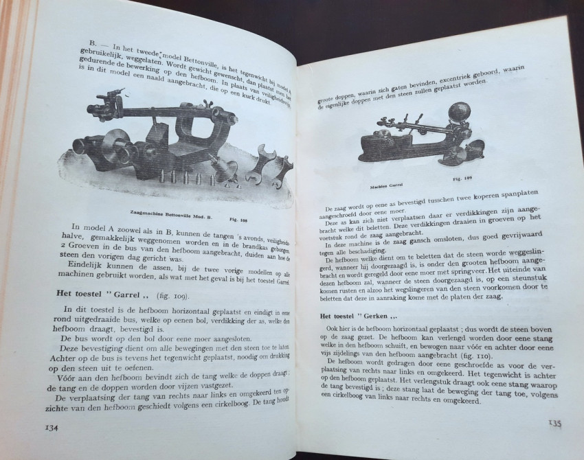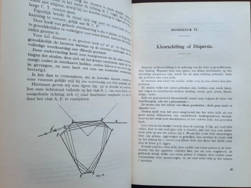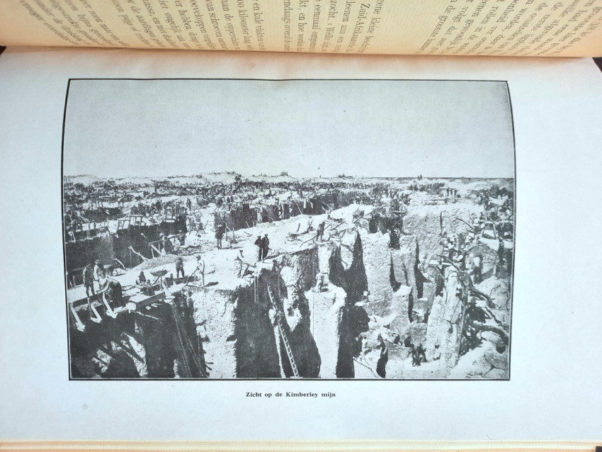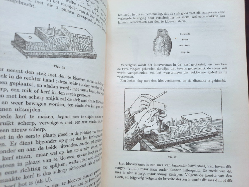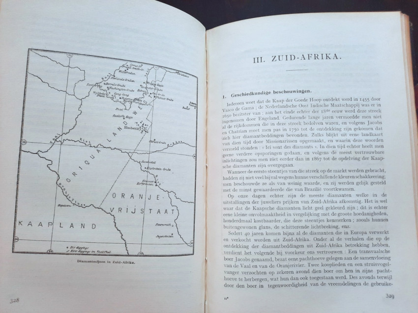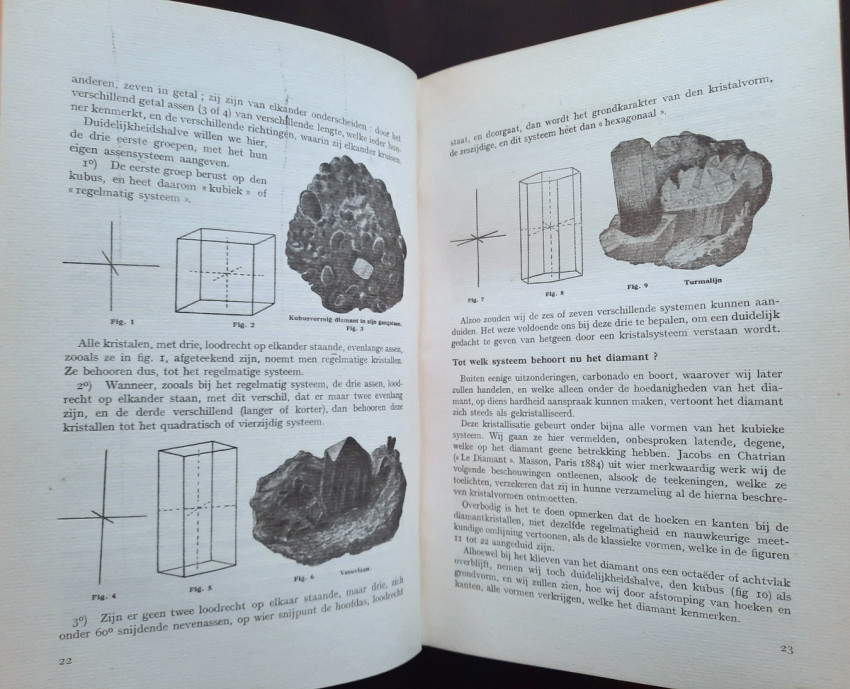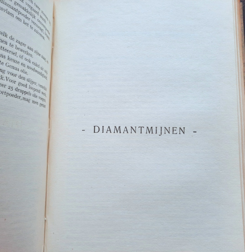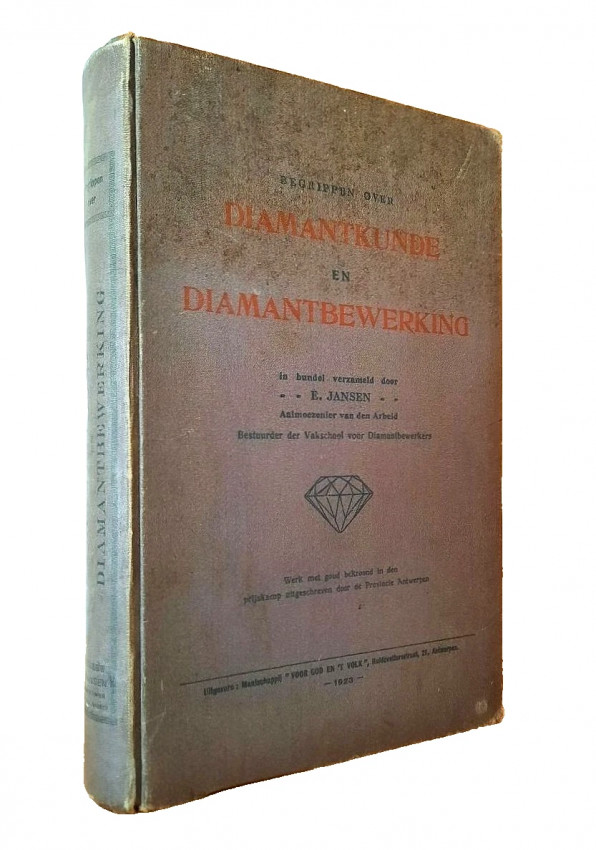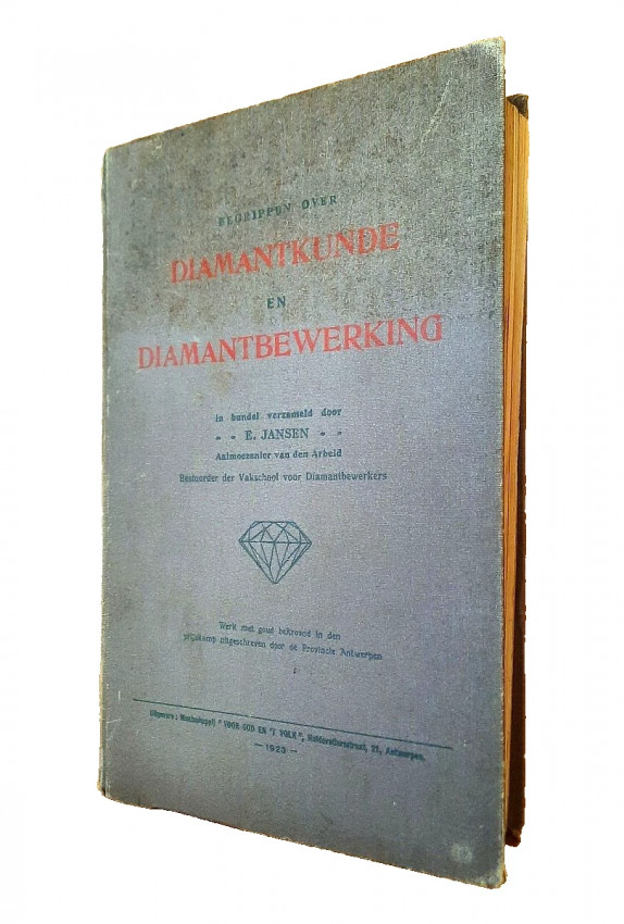 "Begrippen over diamantkunde en diamantbewerking. In bundel verzameld door E. Jansen. Aalmoezenier van den Arbeid. Bestuurder der Vakschool voor Diamantbewerkers."; Original publisher's grey cloth; Text in Dutch; Collation complete - Title page, 391 pages, with 400 b/w drawings in-text, 11 photographic plates, 3 maps and one folding sketch map; Binding is strong, tight and firm, with usual traces of shelf wear, little dusty and with some discoloration. Boards little bumped and wavy, spine rubbed and bumped to the extremities, corners crushed. Generally hinges are strong and secure, only rear hinge is little weak, but whole. Text block/pages clear and very bright, no marks throughout, little age tanning, some pages with fingerprints to margins and a few little brown spots to a few text pages. Overall a well preserved copy.