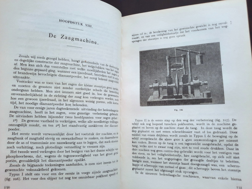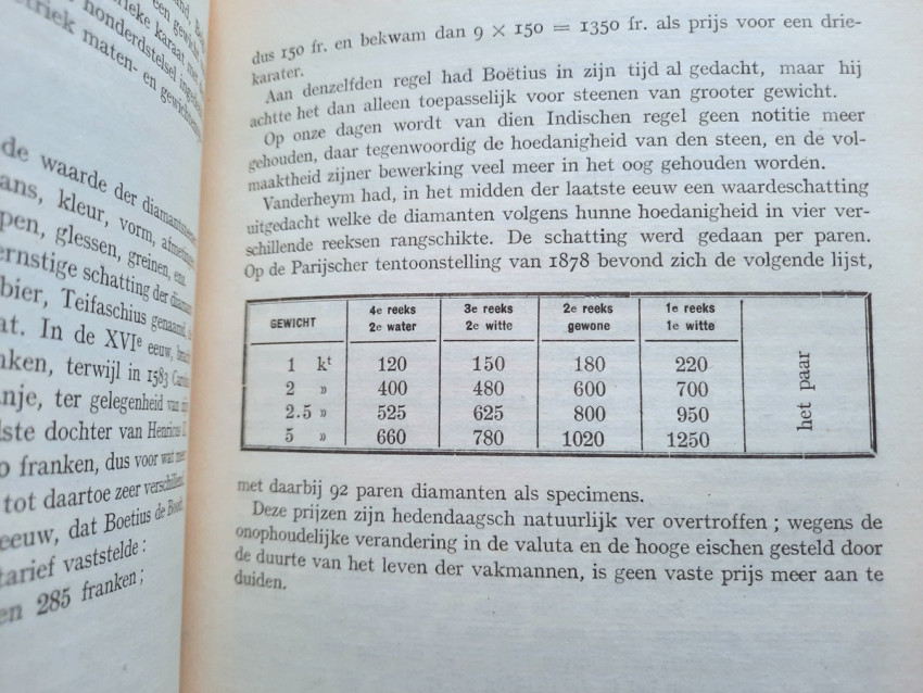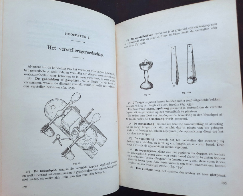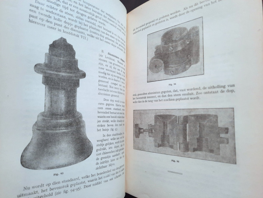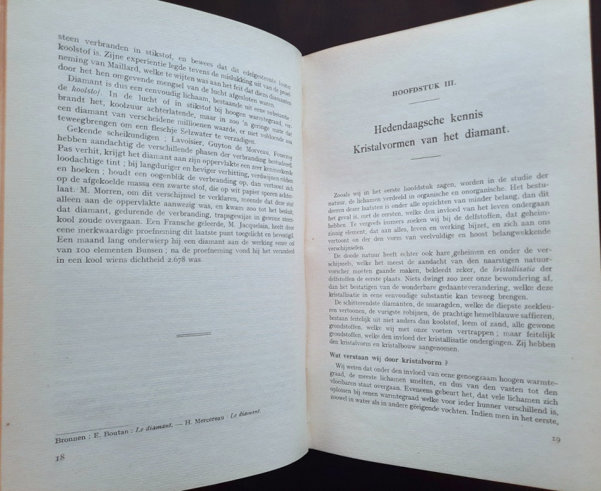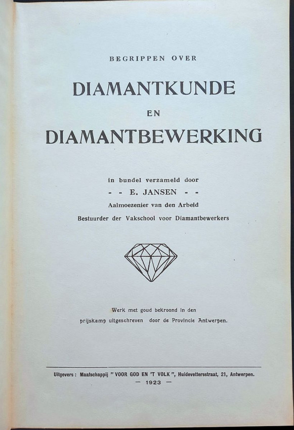 Originally written in Dutch, this momentous work titled "Concepts about diamond science and diamond processing", collected in volume by E. Jansen, the Director of the Vocational School for Diamond Workers, giving a complete view to the diamond science, diamond cutting, diamond processing, diamond industry and trade, the most important diamonds in the world and the most important diamond mines from the time. Contains over 400 b/w drawings in-text, 11 photographic plates, one sketch illustration, 3 maps and one folding sketch map. Printed in a small limited edition, this is an extremely rare copy of this precious work.