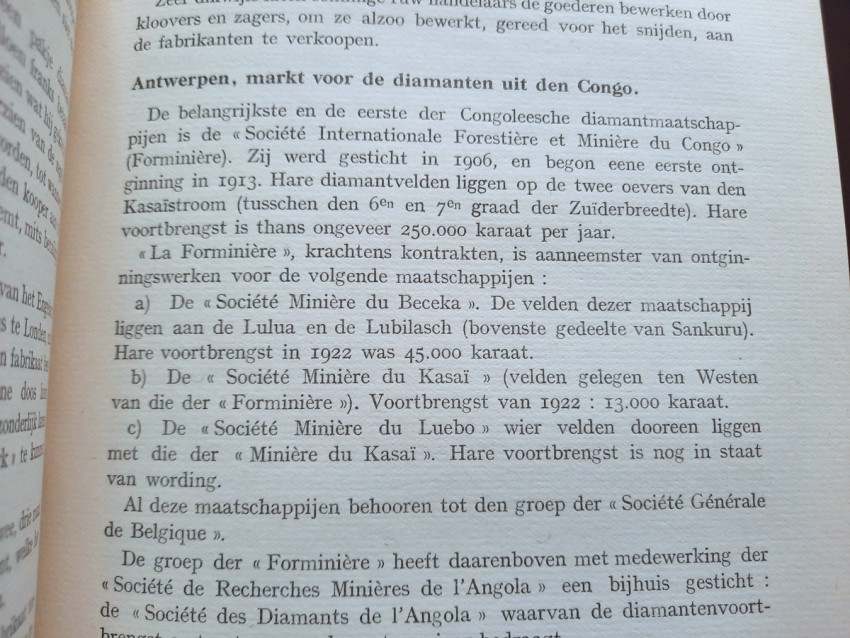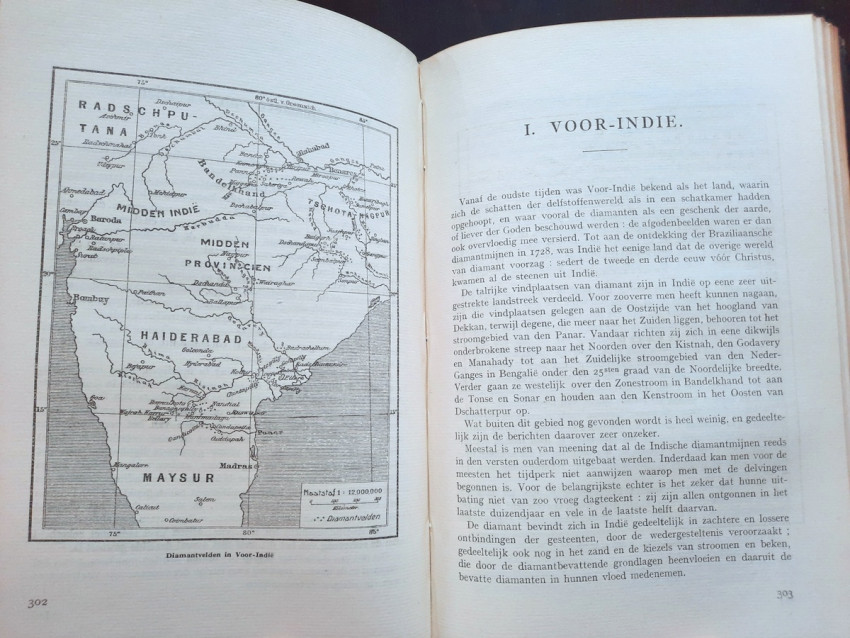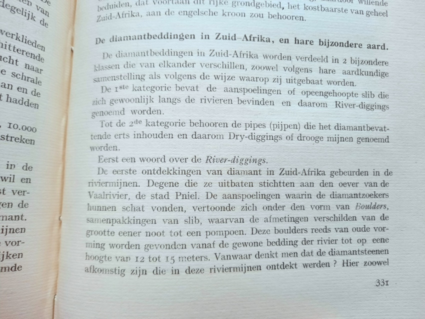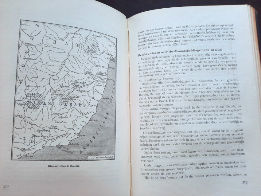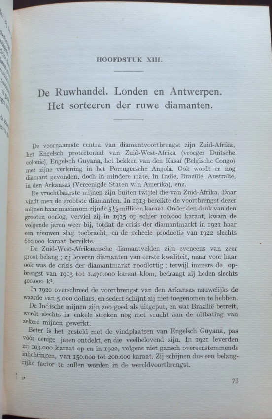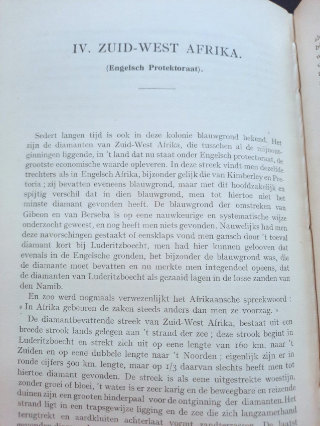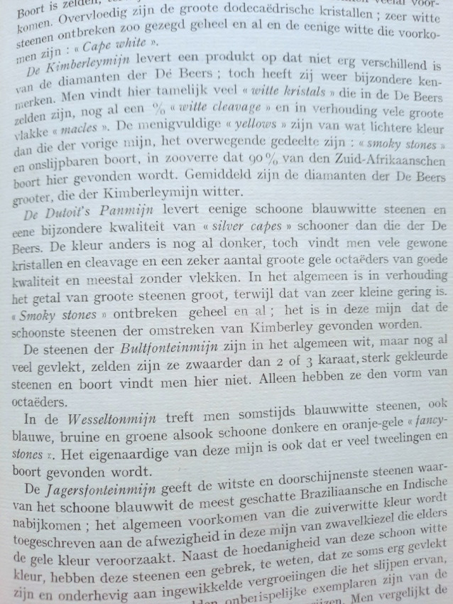 The chapter "Diamond Mines" contains sections about the diamond findings in South Africa (with the sketch map of diamond mines and 4 photographic plates), South-West Africa, Belgian Congo (with the folding sketch map of the diamond beds in the Kasai region by P. Lancsweert), Brazil (with the sketch map of diamond fields) and India (with the sketch map of diamond fields).