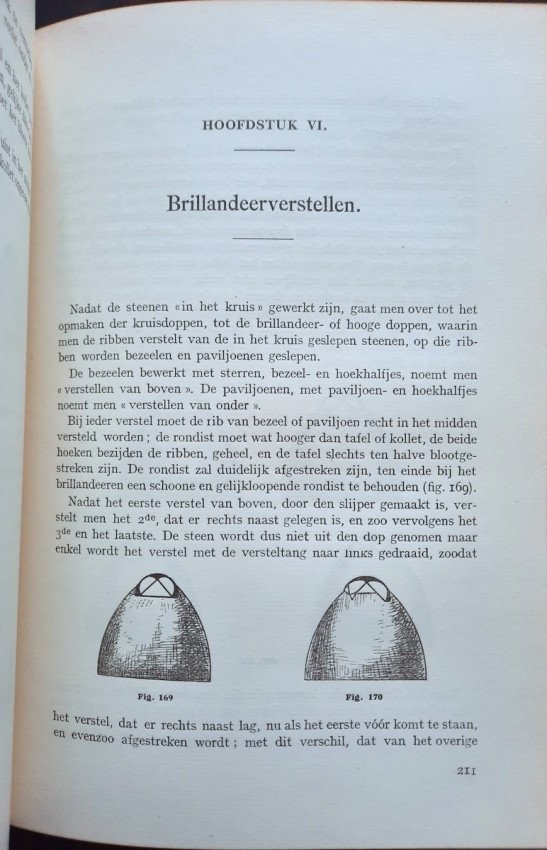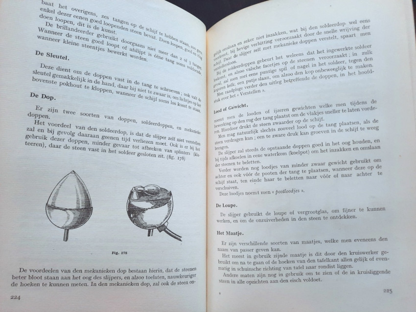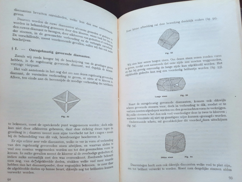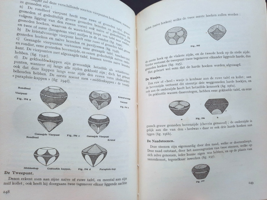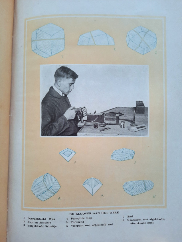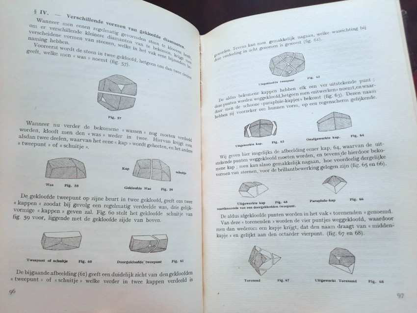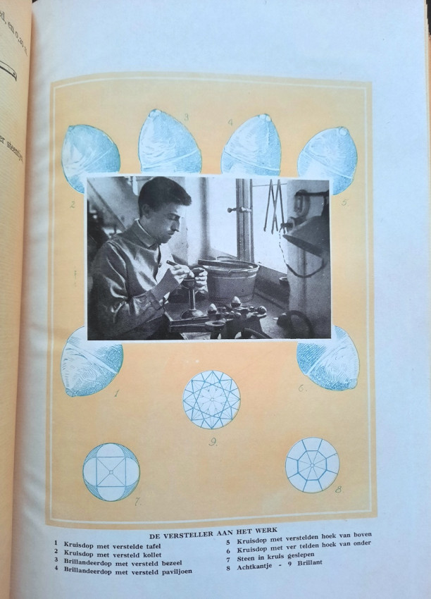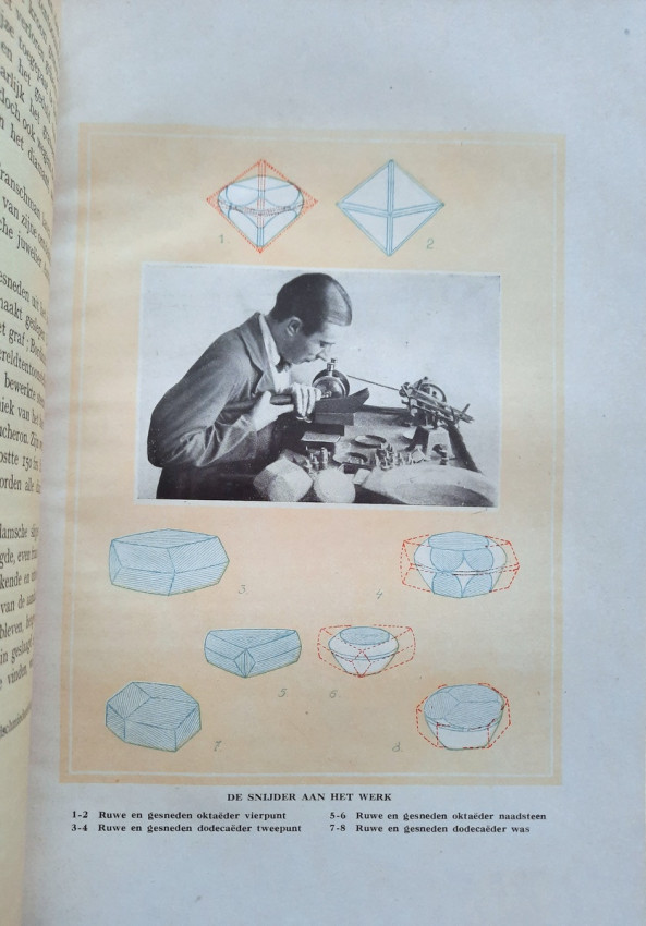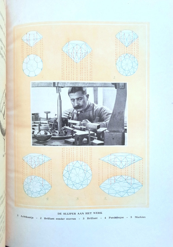 "An instructional manual designed to provide apprentices in the diamond cutting industry with a fund of information on the nature and properties of the diamond, details on all aspects of the cutting craft, and a general background in other matters concerning the diamond and the industry... At the time, this was the most complete instructional manual on diamond cutting available." (Gemology by J. Sinkankas, entry no. 3183.)