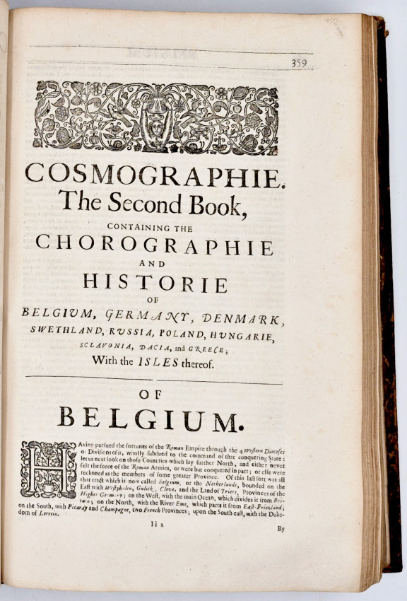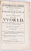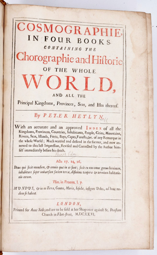'...and perhaps his most famous work, the Cosmographie. Published in 1652 this was an enormous and highly popular expansion of his earlier Microcosmos into a folio volume of nearly a thousand pages, and was sufficiently well regarded that the council of state saw fit to obtain a copy for their better instruction.'