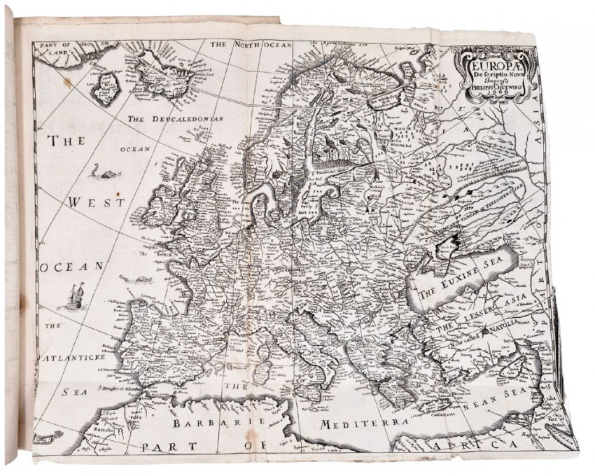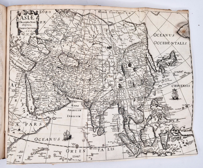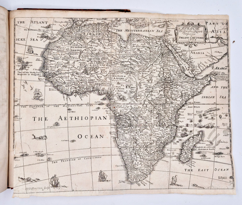 Three title pages: 1. Engraved title page - Printed for Philip Chetwind in Aldergate Street over and against New Street 1666. 2. Printed title pages in red and black - London, Printed for Anne Seile, and to be sold at her shop over against St. Dunstans Church in Fleet-Street, M.DC.LX.VI. and 3. a third title page printed in black, Printed for Philipp Chetwind, Anno Domini 1665. (xvi), 109, (ii table), (ii Appendix title), 1089 - 1095 Appendix, (i blank), (xxxix Table), pages, 4 folding maps, contemporary full sprinkled calf, upper board detached, red title label on the spine, bound as a tight back, contents clean and free foxing.