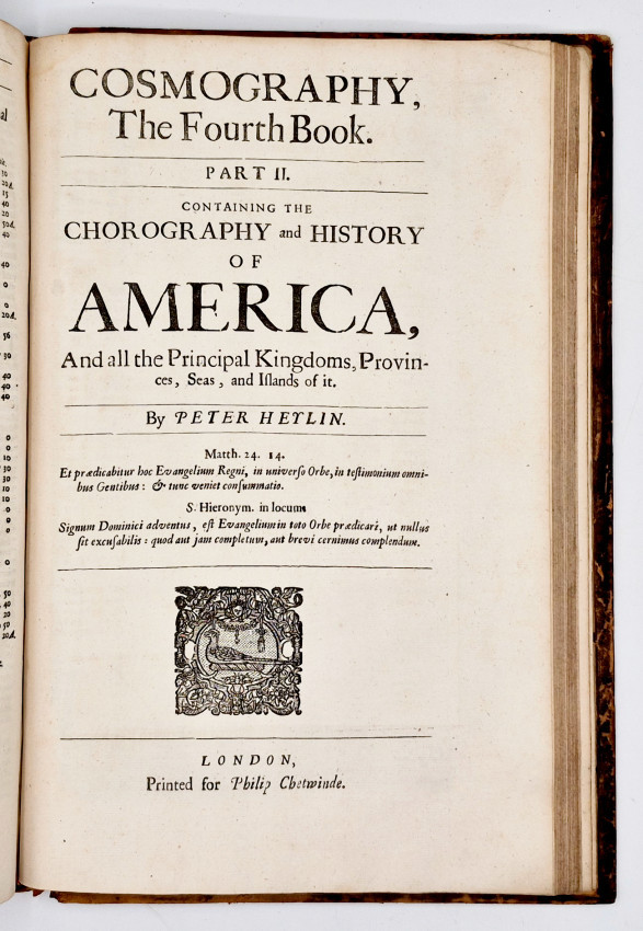 Wikipedia (https://en.wikipedia.org/wiki/Peter_Heylyn) 'He was the writer of the "Cosmographie", an attempt to describe in meticulous detail every aspect of the known world in 1652, the geography, climate, customs, achievements, politics, and belief systems. It appears to have been the first description in print of Australia, and perhaps of California, Terra del Fuego, and other territories in the New World. He objected to the name "America" as it placed undue glory on Amerigo Vespucci, and recommended "Columbana" or "Cabotia" as more indicative of the true discoverers, Columbus and Cabot.'