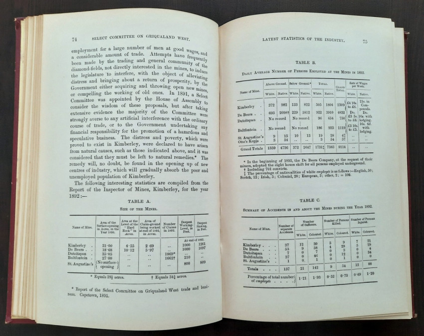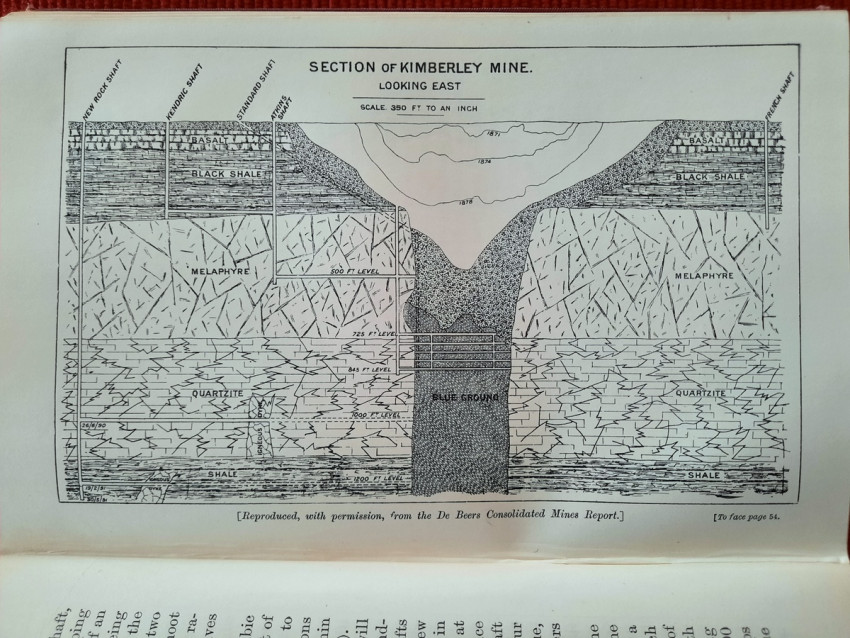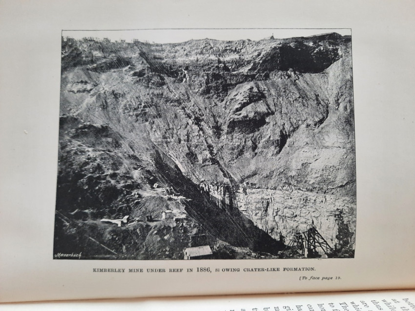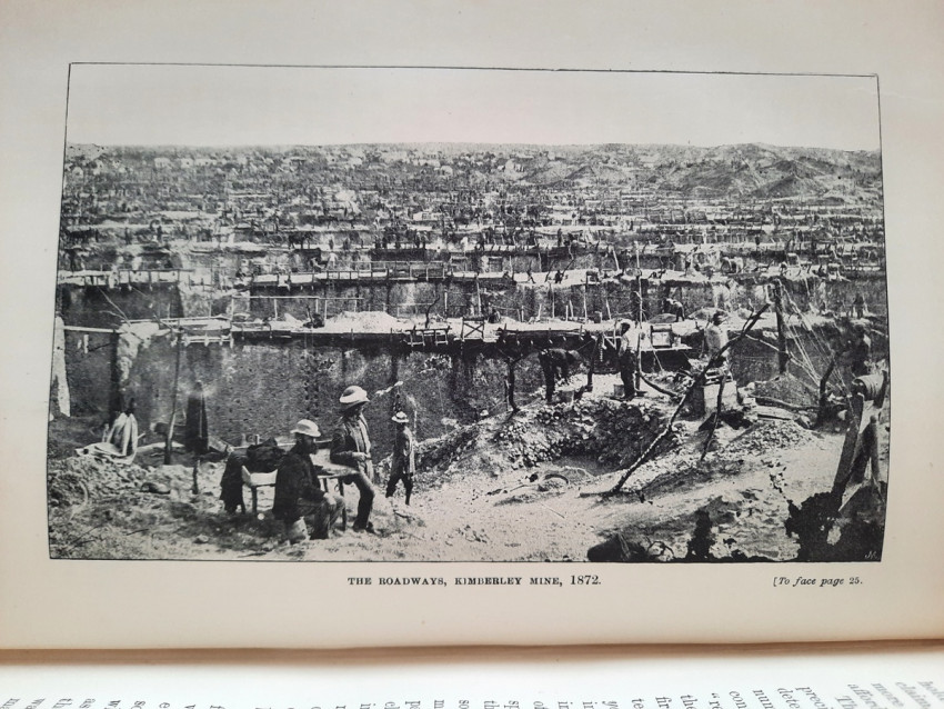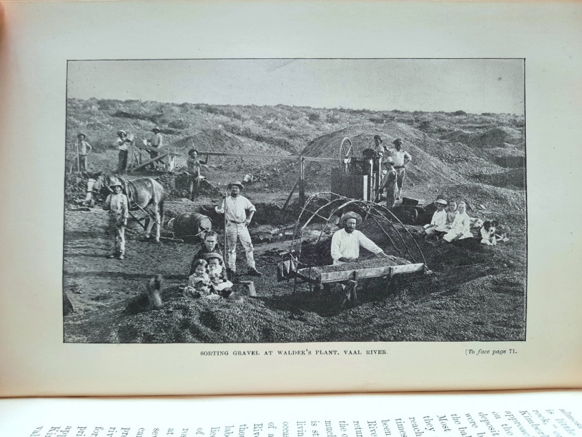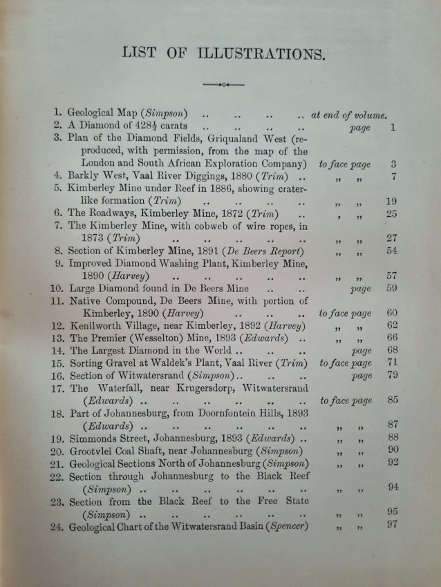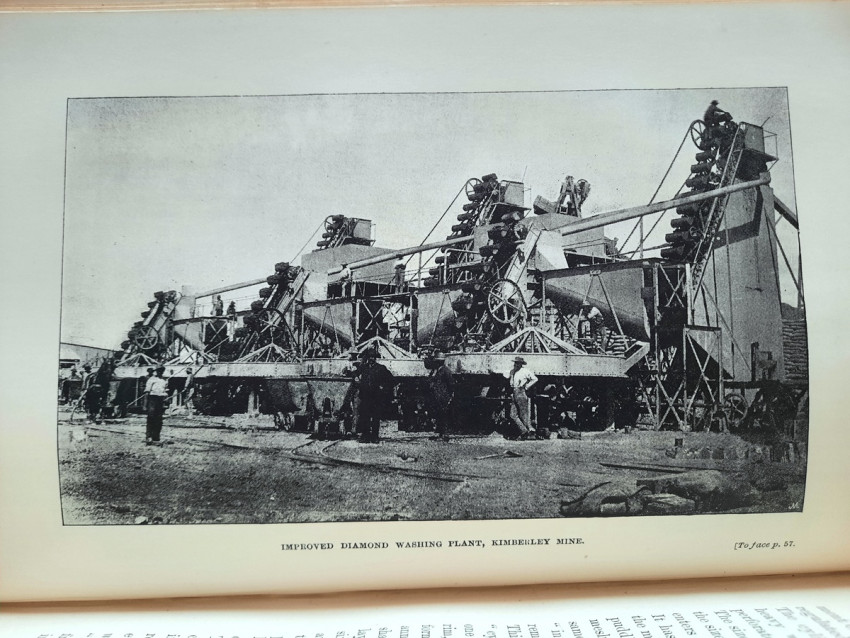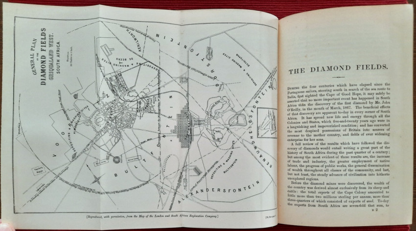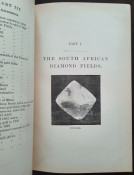 This study of diamonds and gold in South Africa contains numerous photographic illustrations, maps, plans, tables, statistics (values, trading, capita, supplies, profits, dividends, etc.) including a details of exploration methods and facts. With 32 illustrations, folding General Plan of the Diamond Fields Griqualan West in South Africa and folding Geological Map of South Africa.