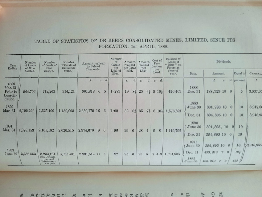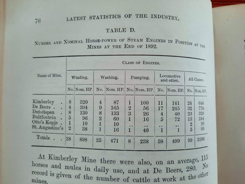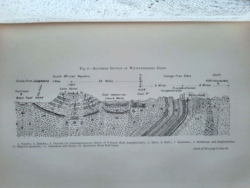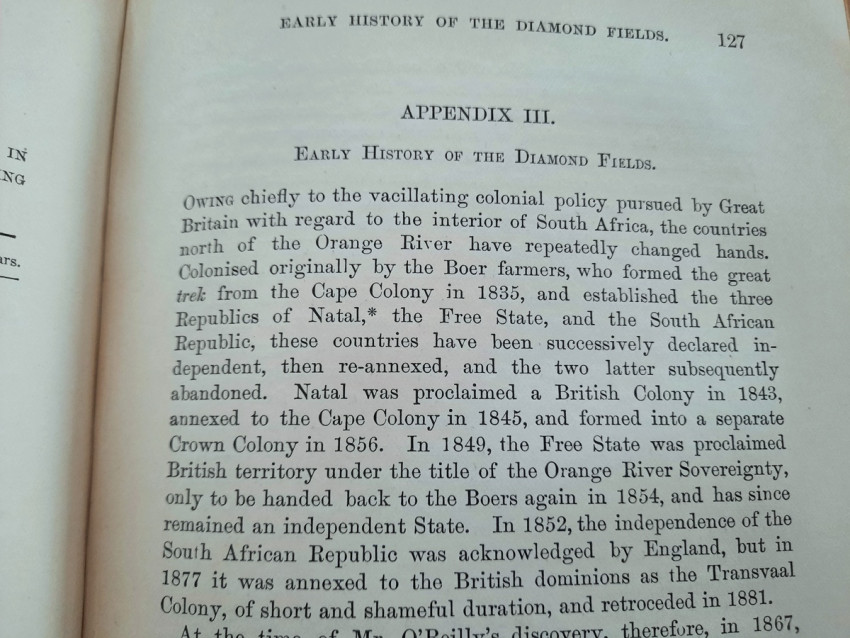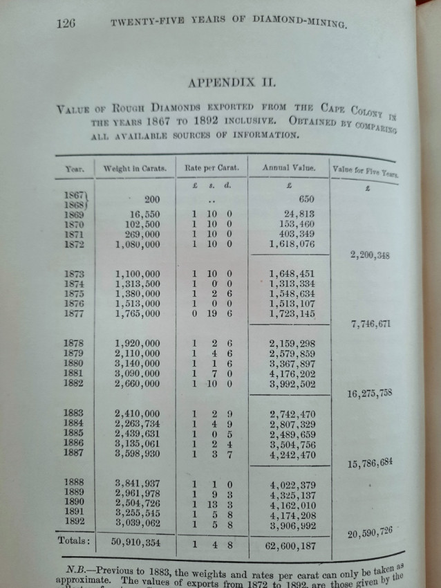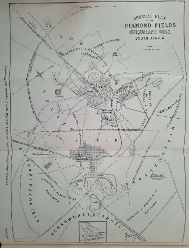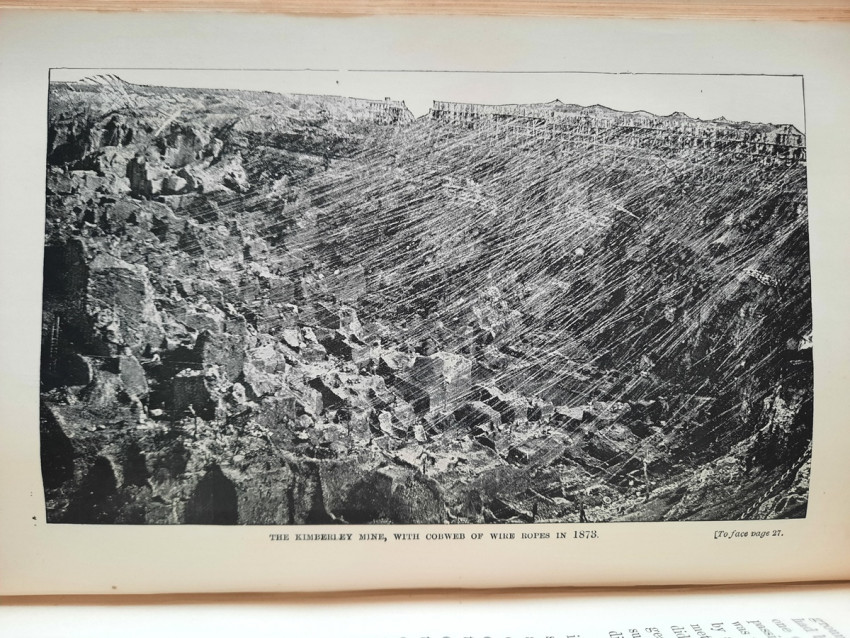This study of diamonds and gold in South Africa contains numerous photographic illustrations, maps, plans, tables, statistics (values, trading, capita, supplies, profits, dividends, etc.) including a details of exploration methods and facts. With 32 illustrations, folding General Plan of the Diamond Fields Griqualan West in South Africa and folding Geological Map of South Africa.