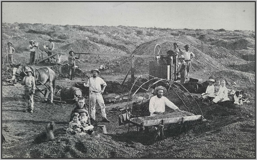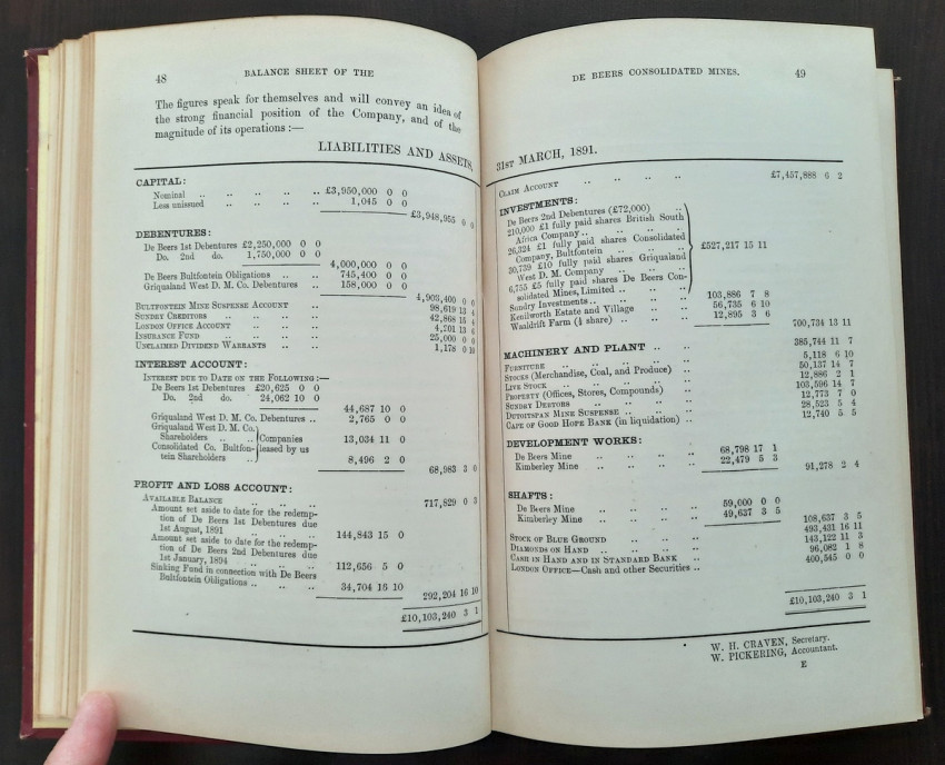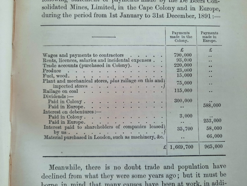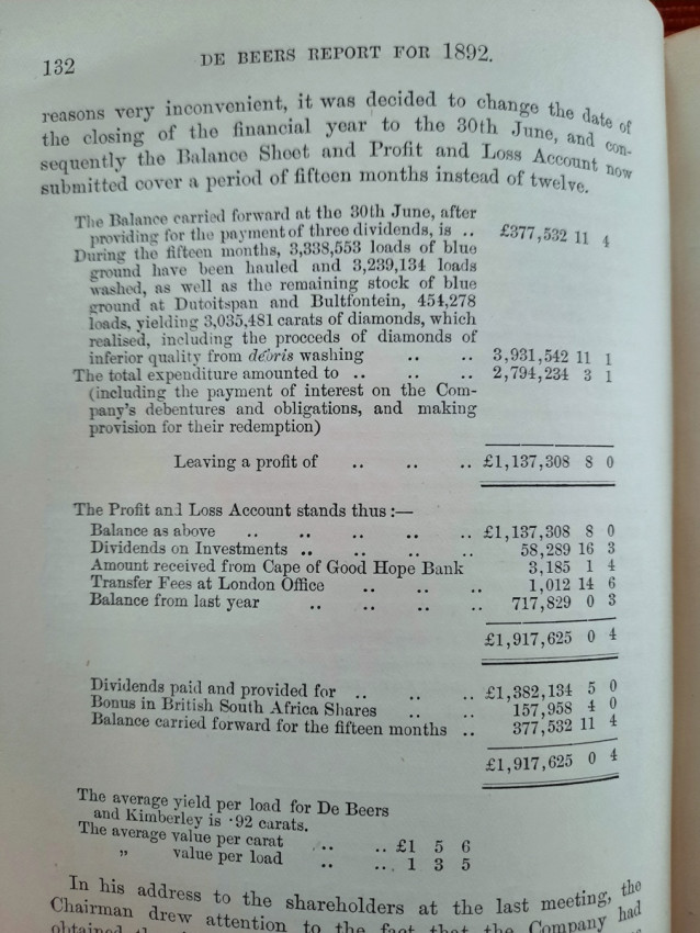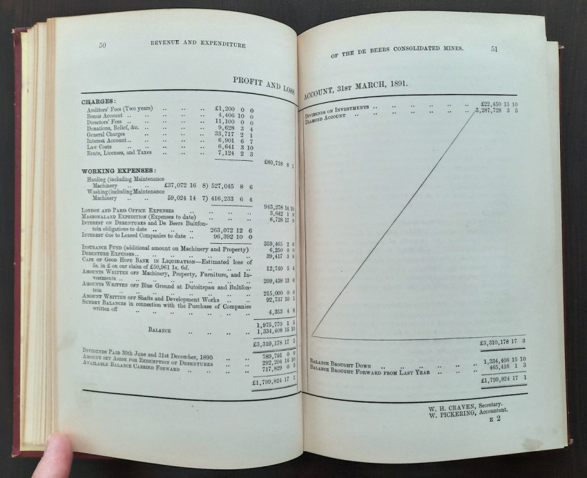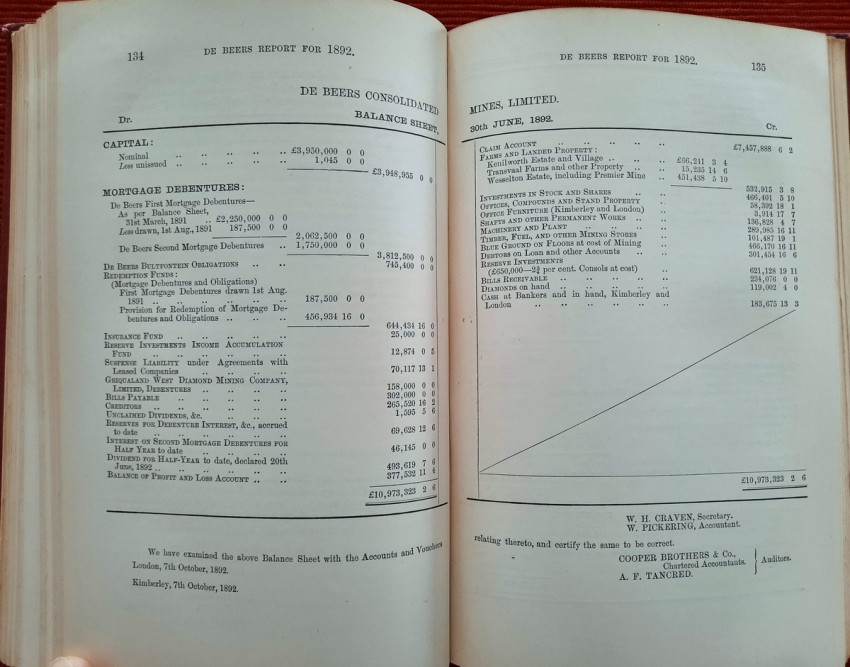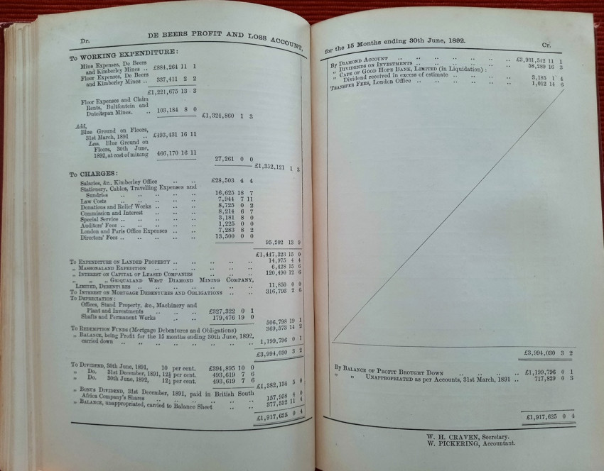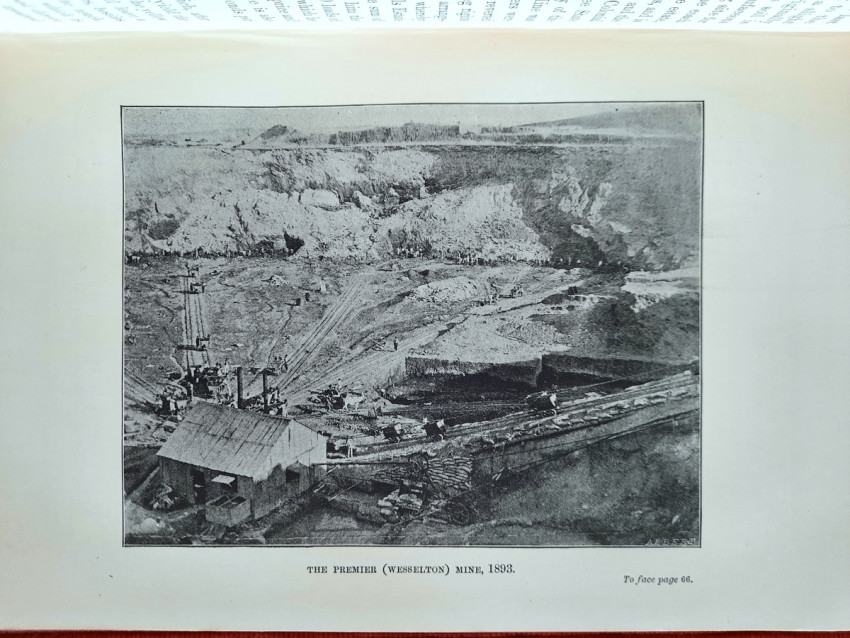 This study of diamonds and gold in South Africa contains numerous photographic illustrations, maps, plans, tables, statistics (values, trading, capita, supplies, profits, dividends, etc.) including a details of exploration methods and facts. With 32 illustrations, folding General Plan of the Diamond Fields Griqualan West in South Africa and folding Geological Map of South Africa.
