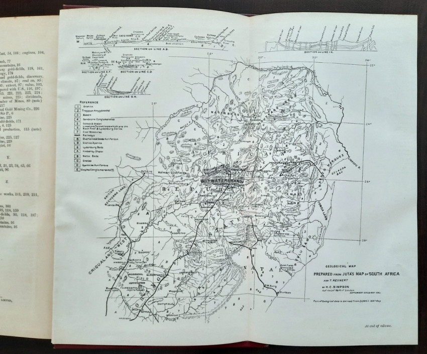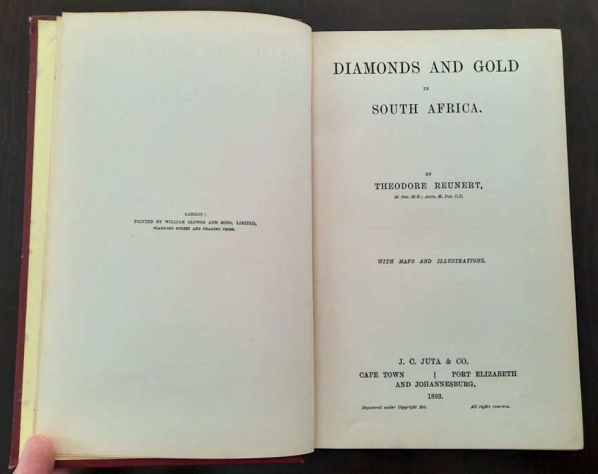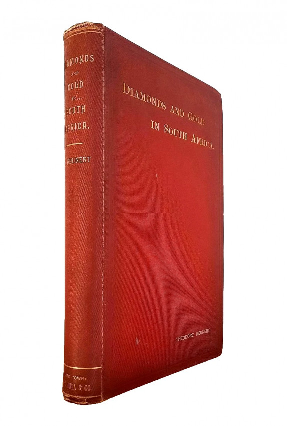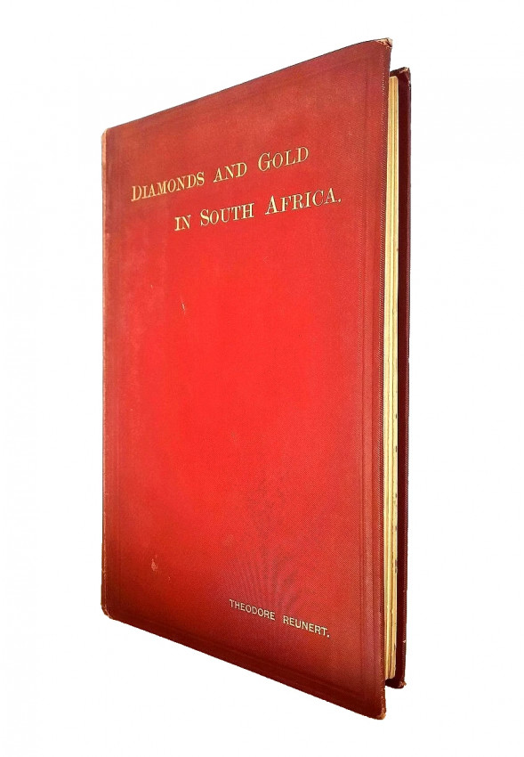 "Diamonds and Gold in South Africa. By Theodore Reunert, with maps and illustrations."; London: William Clowes and Sons, Ltd. / Cape Town, Port Elizabeth and Johannesburg: J. C. Juta & Co., 1893; Original red cloth harcovers; Text in English; Collation complete – Title page, XVI, 242 pages (including the Index), with 32 illustrations, folding General Plan of the Diamond Fields Griqualand West in South Africa and folding Geological Map of South Africa; Overall in excellent condition for the age. Binding with usual shelf wear, extremities bumped and little scuffed, spine with minor discolouration, a few surface scratches to the boards. Otherwise the binding is tight and firm, keeps strong and secure, joints and hinges are whole and secure. Pages/text block well preserved, very bright and clear, no foxing or marks throughout. A sound copy.