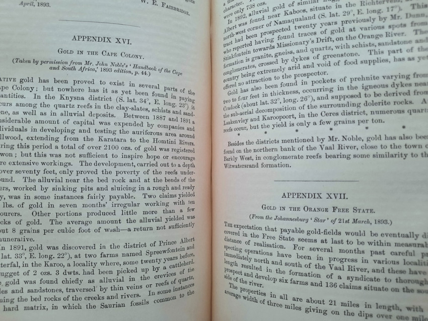 Part III. – Appendices. Containing statistical tables and original articles by experts on the several subjects treated of. (De Kaap Goldfields; The Witwatersberg Goldfields; The Murchison Range; The Witwatersrand Goldfields; Transvaal; The Tati Gold Fields; De Beers Mine; Kimberley Mine; Bultfontein and Dutoitspan Mines; The Mashonaland Goldfields; Gold in the Cape Colony; Gold in the Orange Free State; Gold in Zululand. The Vryheid Banket Gold Fields; The Great Borehole of the Rand-Victoria Gold Mines; The Transvaal Silvermines; History of the MacArthur-Forrest Process of Gold Extraction; etc.)