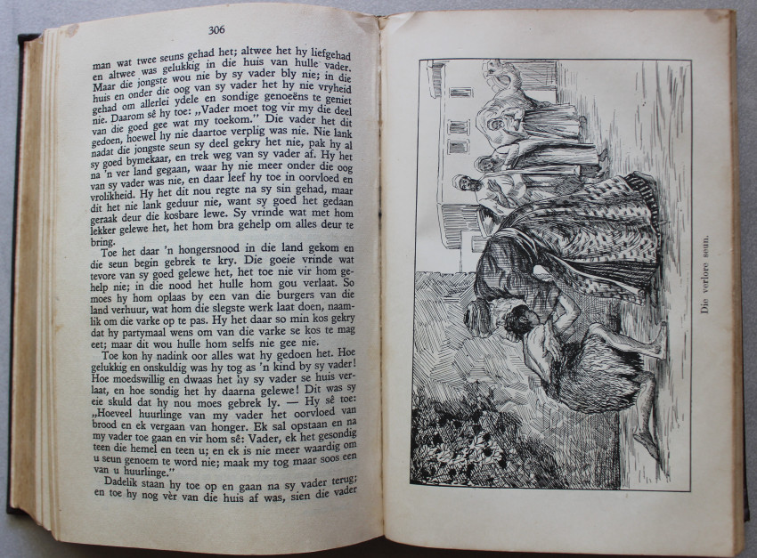Die Geskiedenisse van die Bybel op die eenvoudigste wyse voorgedra, veral vir huislike gebruik. Bewerk deur 'n Leraar van die Gereformeerde Kerk in Suid-Afrika. Met een fraaie gekleurde en dertien swarte prente. Afrikaanse Uitgawe. 459 bladsye.