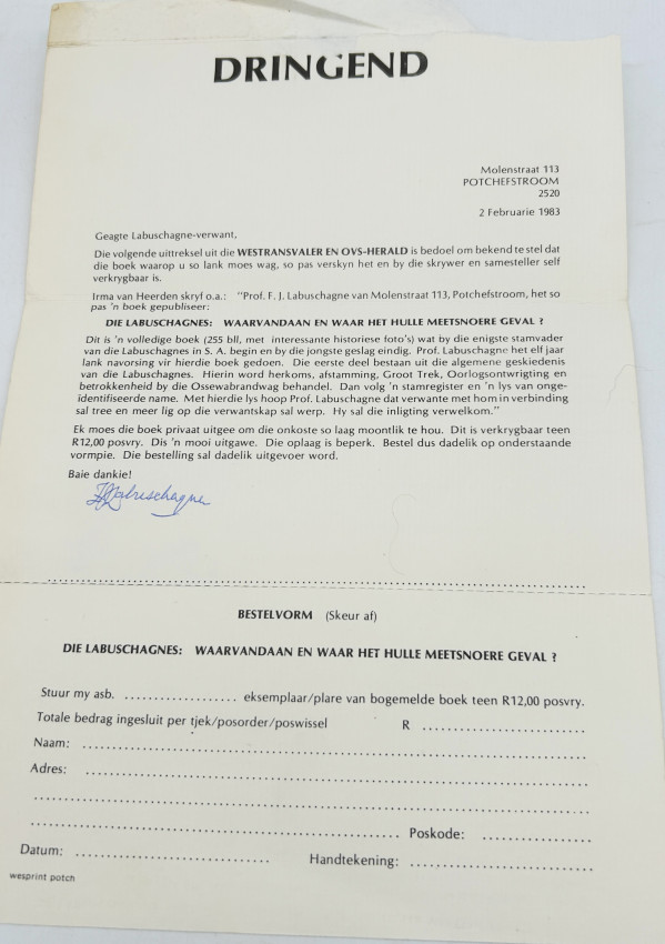 There is also an order form with the book that is signed by the author, and includes the following information (in Afrikaans):
