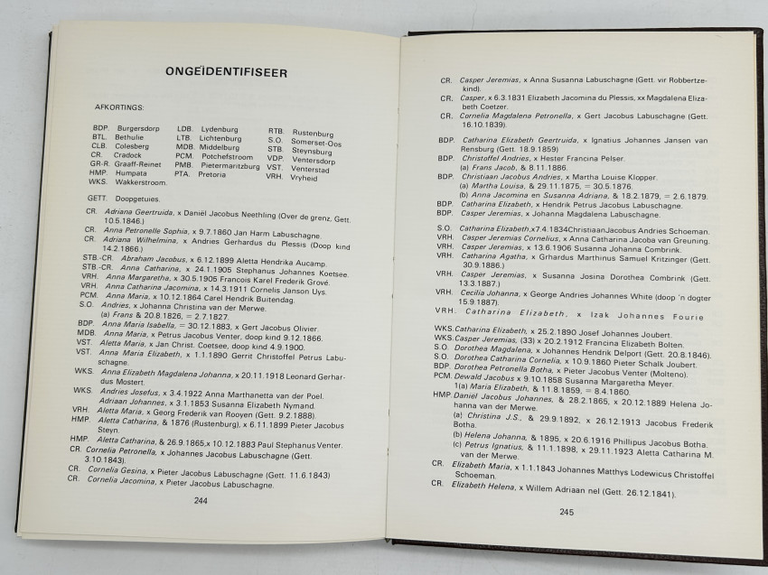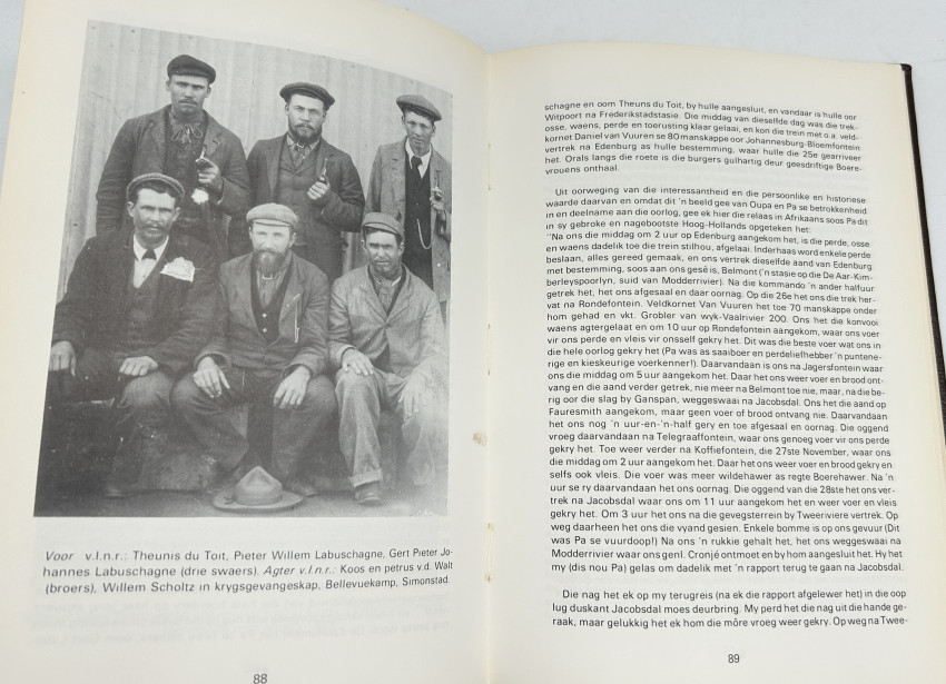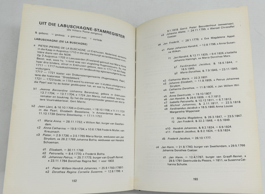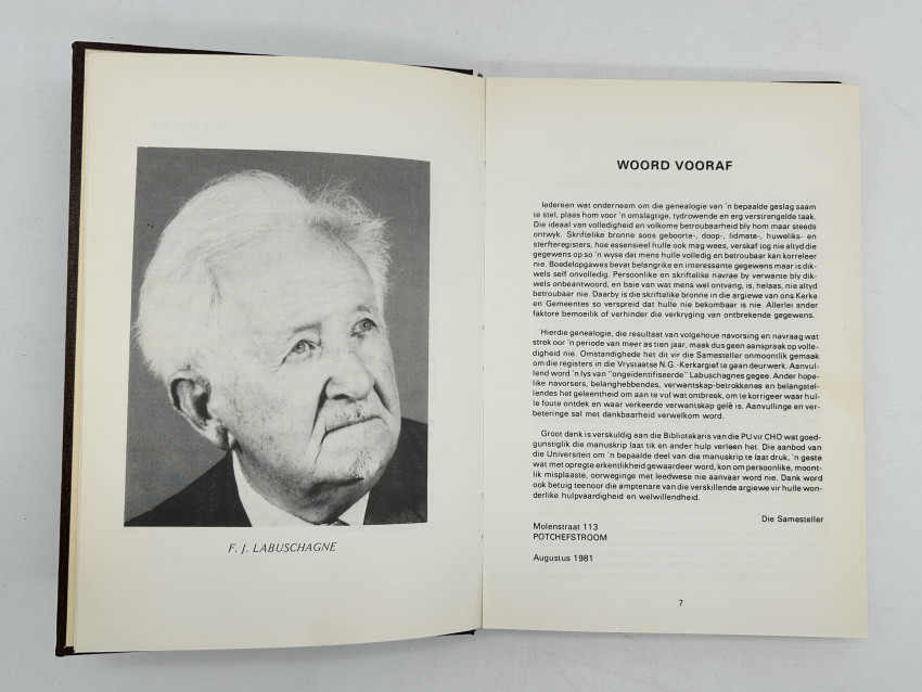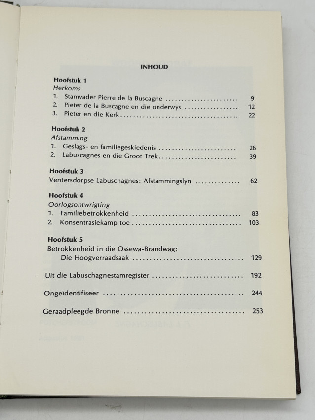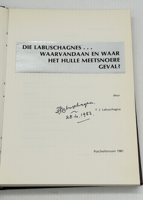 Dit is 'n volledige boek (255 bll. met interessante historiese foto's) wat by die enigste stamvader van die Labuschgnes in S.A. begin en by die jongste geslag eindig. Prof. Labuschagne het elf jaar lank navorsing vir hiedie boek gedoen. Die eerste deel bestaan uit die algemene geskiedenis van die Labuschagnes. Hierin word herkoms, afstamming, Groot Trek, Oorlogsontwrigting en betrokkenheid by die Ossewabrandwag behandel. Dan volg 'n stamregister en 'n lys van ongeidentifisserde name. Met hierdie lys hoop Prof. Labuschagne dat verwante met hom in verbinding sal tree en meer lig op die verwantskap sal werp. Hy sal die inligting verwelkom.