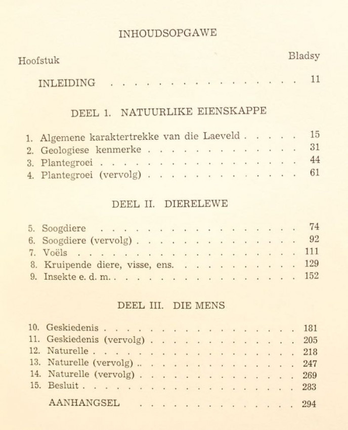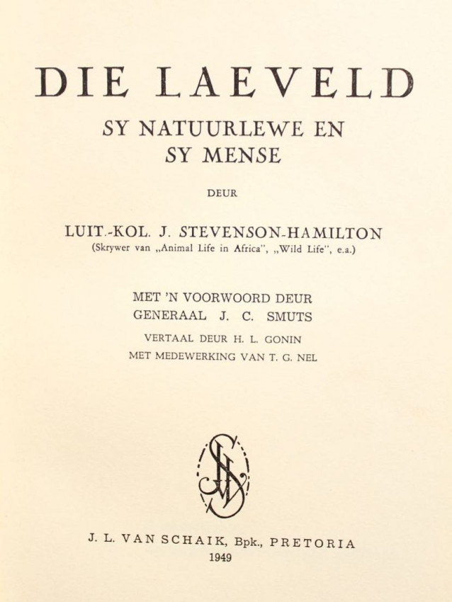 This is the first Afrikaans edition (translated by H.L. Gonin) of Stevenson-Hamilton's "The Low-Veld: Its Life and Its People".