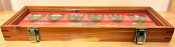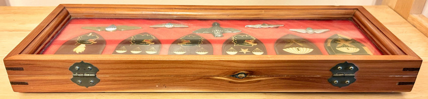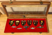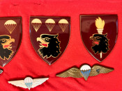 A collection of 11 badges off the South African 44th Parachute Brigade. They are mounted inside a well crafted wooden display box, behind a glass lid fitted with catches. Badges mounted on red felt.