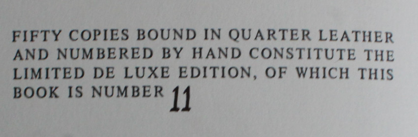 Fifty copies bound in quarter leather and numbered by hand consitute the limited De Luxe Edition, of which this is book number 11.
