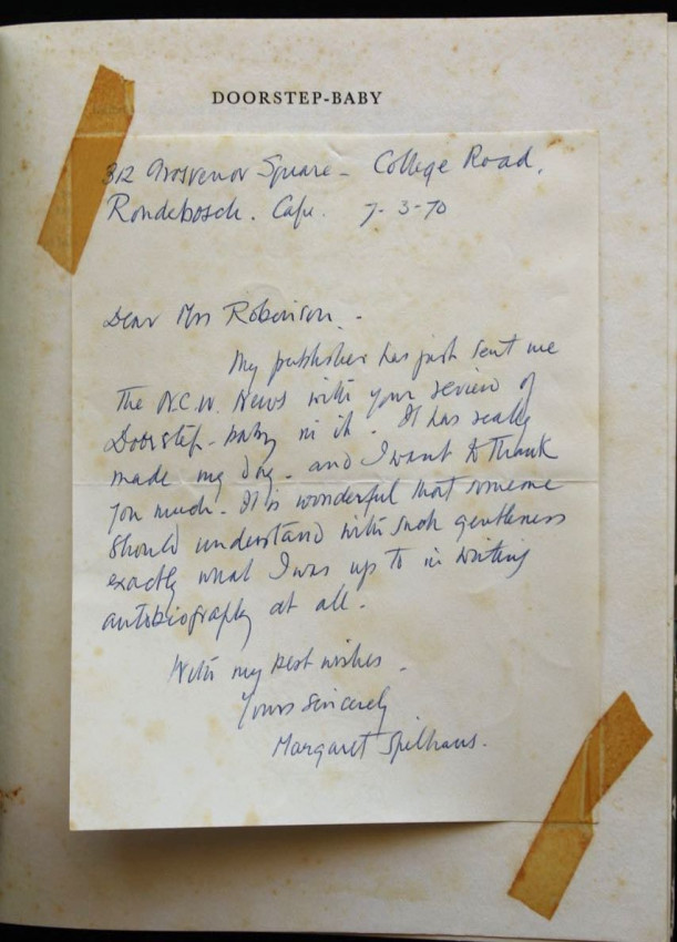 Former owner's name (Helen Robinson) on front endpaper. Robinson's review of this book is on the verso of the front endpaper. Handwritten letter by Margaret Spilhaus (dated 7/3/'70) on half-title page thanking Robinson for her kind review of the book.