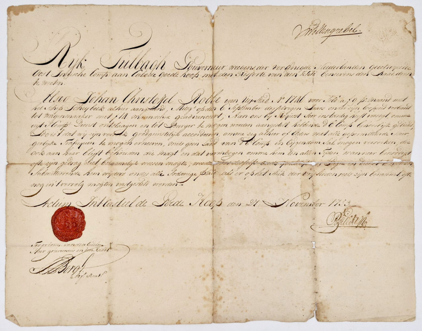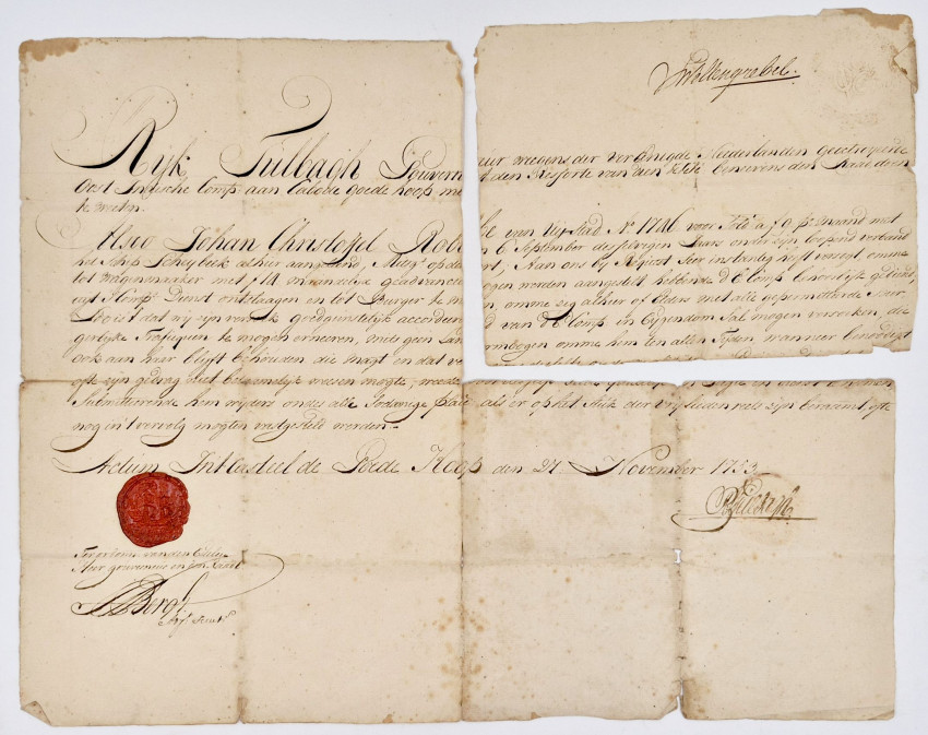 Single sheet of laid paper, 330 x 420 mm, written on one side only, folded - worn at the folds and one quarter is detached, with the official red wax seal of the VOC; signed by Governor Tulbagh and the Secretary of the Council of Policy. Dated 21 November 1753.