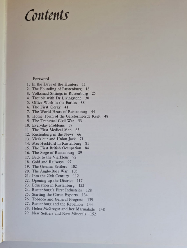 The book chronicles the development of Rustenburg as a key Voortrekker settlement proclaimed in 1851 and named for its restful location amid the Magaliesberg mountains.Highlighted are its founding after Voortrekker farmers settled the area in 1841 following the defeat of Mzilikazi's Ndebele forces, its growth spurred by platinum mining discovered in 1925, and its significance as Paul Kruger's hometown, where he retreated to his nearby farm