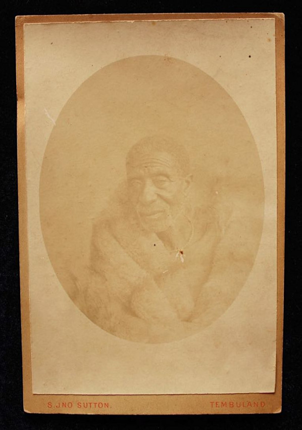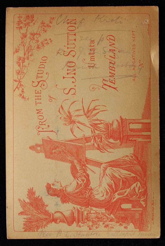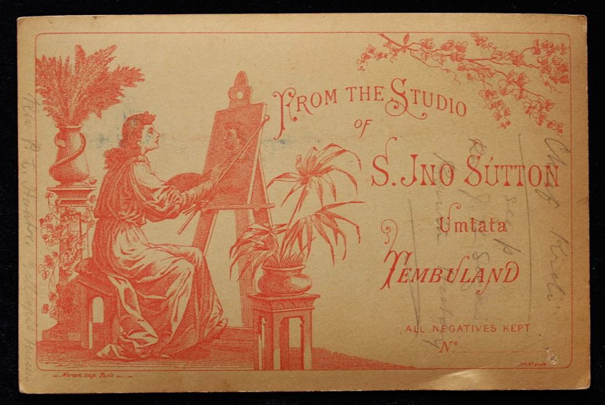 An exceedingly rare studio card by S. John Sutton who worked from Umtata, Tembuland. The location description on the card is interesting as Tembuland was annexed by the Cape Colony in 1885 and was afterwards known as Transkei. This dates the image to shortly before 1885 but quite possibly around 1878 when Kreli (1810-1892), King of the Xhosa nation from 1835 until his death in 1892, voluntarily surrendered to the British forces after he led a series of frontier wars.