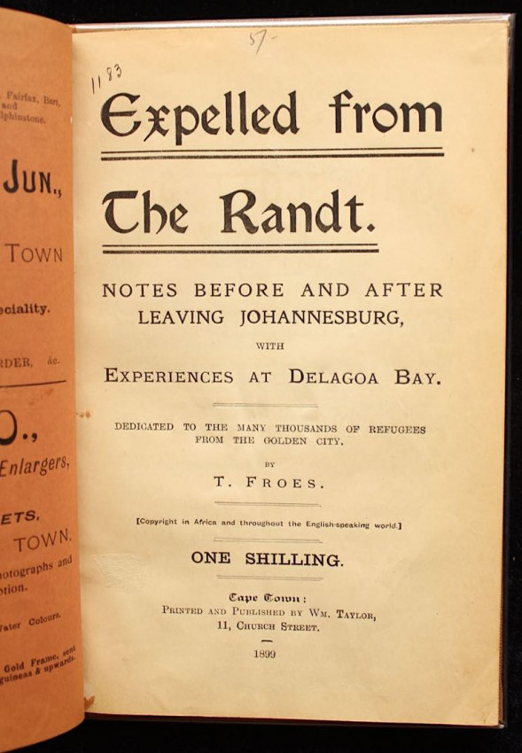 There is some information as to the influx of refugees to Delagoa Bay, and their subsequent removal to British ports. The author asserts that he has spared no pains in order to authenticate those statements made in the pamphlet, as to facts which did not come within his personal knowledge and experience.' - Mendelssohn Vol.I, page 577