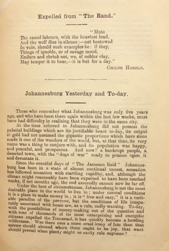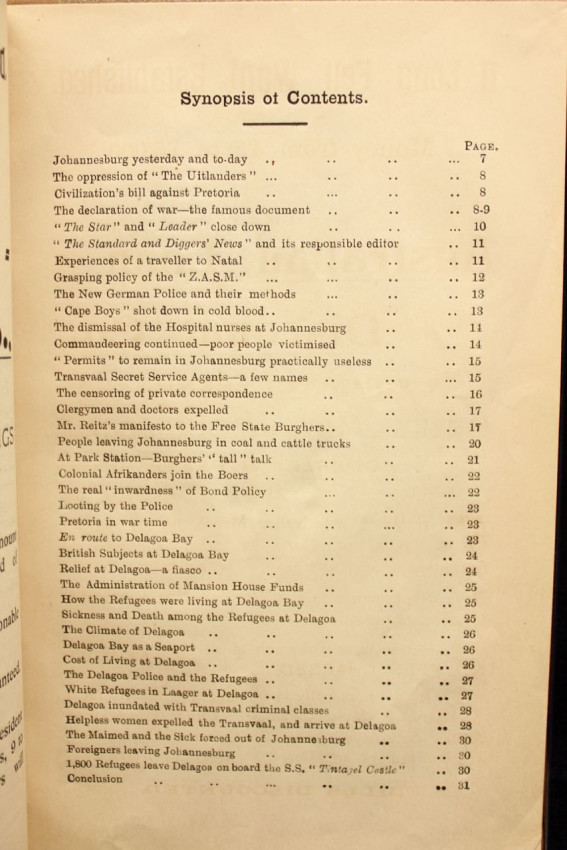 'A description of the state of affairs in Johannesburg and the Transvaal, at the time of the outbreak of the war, and subsequent to the dates on which the independent Johannesburg press - The Star and The Leader - ceased publication. Many incidents are related showing the behaviour of the Boers to the Uitlanders who were leaving the country, and Mr. Reitz's manifesto is given in full.