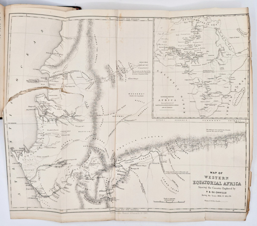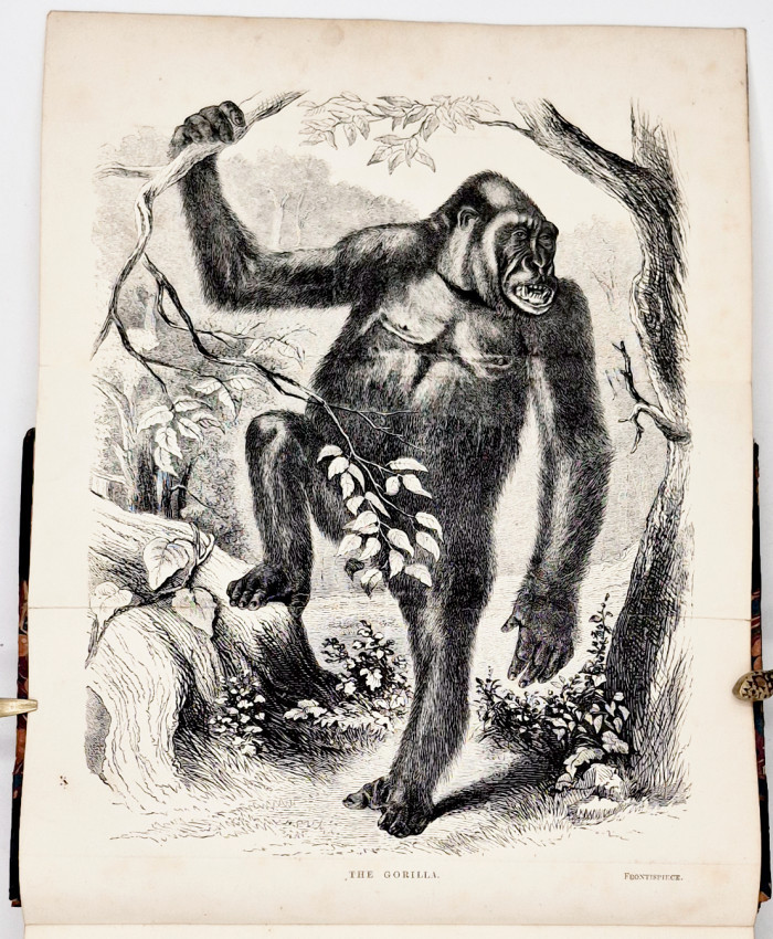 Second Edition: 479 pages, folding frontispiece of a gorilla, 28 wood-engraved plates and numerous illustrations in the text, folding map frayed at the fore edge and torn at the first fold, half black calf with red title label, marbled endpapers and boards rubbed, foxing on the preliminary and end pages, bookplate on front paste-down endpaper, a good ex-library copy with stamps.