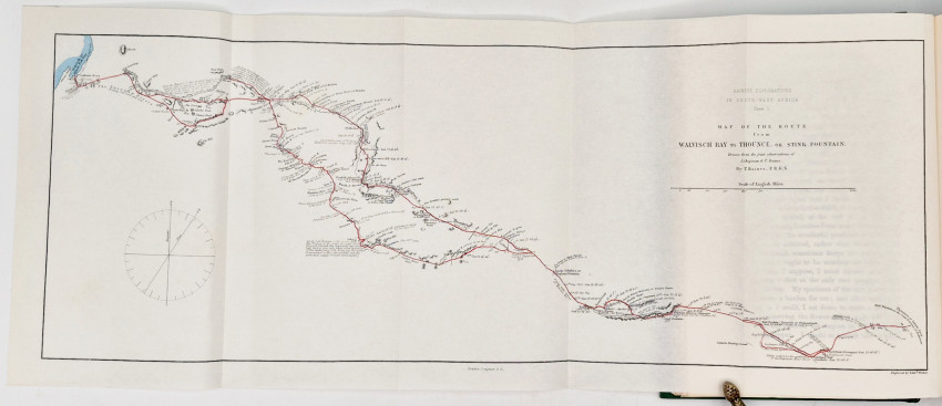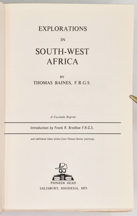 Facsimile reprint: 535 pages, colour frontispiece from the original edition and 4 additional colour plates from paintings by Baines, 7 plates, 27 illustrations in the text, 3 folding maps and maps on endpapers, green cloth with blind tooling on the upper cover, titled gilt on the spine, top edge dyed green, very good copy in the slightly worn dust jacket now preserved in a Brodart protector.