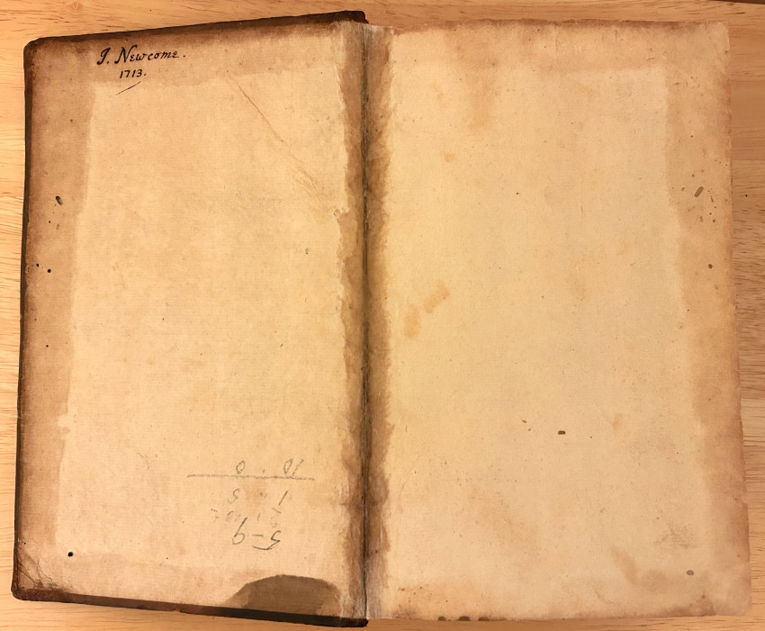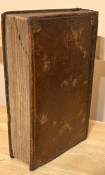 Binding tight Spine has been renovated so that it and the contents remain tight and secure, Some scratches and small area of discoloration (black) to bottom of front cover; also evidence of book worm on front cover. Back cover rubbed and scratched. ‘J. Newcome, 1713’ written in ink on inside of front cover; some pencil marks also.