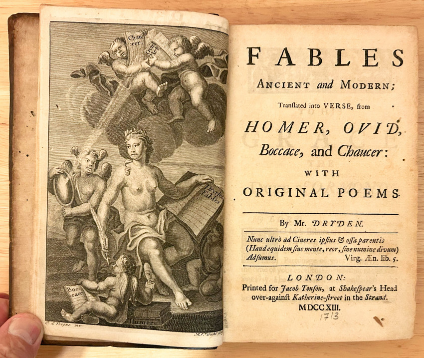 Dedication to his Grace the Duke of Ormond, by John Dryden; Preface; a poem to her Grace the Duchess of Ormond;followed by Palamon and Arcite, or The Knight’s Tale, from Chaucer in 3 Books, Then a poem to my Honour’d Kinsman, John Driden of Chesterton in the County of Huntingdon.