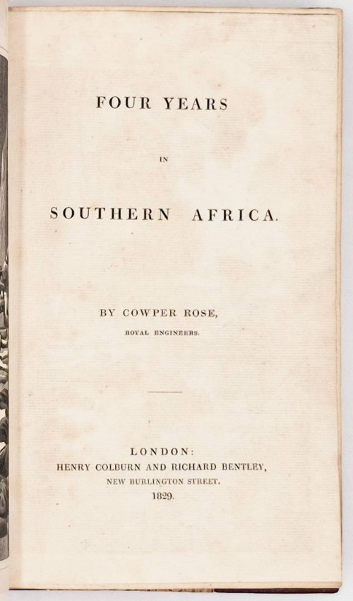 Cowper Rose is an unnoticed early traveller in South Africa. ‘He has been described, lavishly, as both Wordsworthian and Byronic in his prose and outlook.’ He concludes his account as follows: 'It was ten months since I had left the Bay that now lay before me, and in that time I had seen much that, in after life, 1 shall often recall. I had shared the hard life of the elephant-shooter, and slept in the bee-hive hut of the Kaffer, and traversed his beautiful country. I had visited the house of the phlegmatic boor, and the station of the subdued-toned missionary. I had seen most of the savage animals of the country, the elephant, the rhinoceros, the hippopotamus. I had sought for the lion in the country where they were once common, but the tract had been partially settled on; and the wild beasts retire at the appearance of man, with an instinctive feeling, that a being more savage and relentless than themselves has invaded their haunts, and that their ferocity is no match for his. I had seen the many-coloured birds. I had wandered through the gloomy arches of the boundless forests, where the tall trees cast a massive shade that seems never to have been broken by one ray of light. I had seen those trees with their many-coloured blossoms, standing in beauty and in pride, while the rich creepers, that hung like light drapery from their wide-spreading branches, moved with every breeze, affording a striking and mournful contrast. I had seen them stretched at their length, mouldering, fallen untouched by man, in the heart of their own dark forests. I had feasted on the loveliness of flowers, in the country where flowers are the most lovely, and where their beauty gladdens the lone wilderness; for the pride of your greenhouse is, in Africa, but a wild flower. I had seen society under new forms, and Nature as at her birth; and now the Bay lay with its wide sweep stretched before me, dotted with English ships ; and I end as I began, once again in Cape Town.'