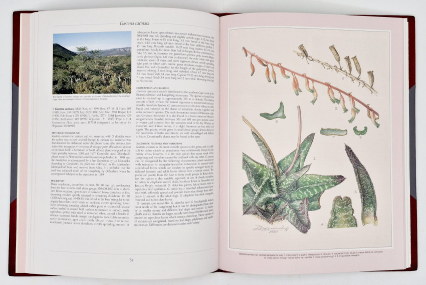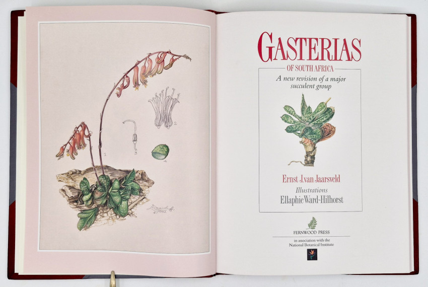This work is the culmination of 13 years research during which the author revised and reduced the number of recognised Gasteria species from one hundred to just sixteen species, with six notable variations. Van Jaarsveld drew on studies of cultivated specimens, plants in their natural habitat, and herbarium samples from both South African and European collections. The text is complimented by fine watercolour illustrations by Ellaphie Ward-Hilhorst.