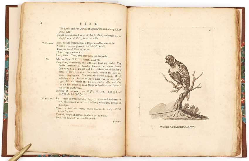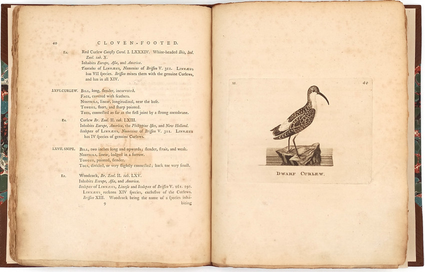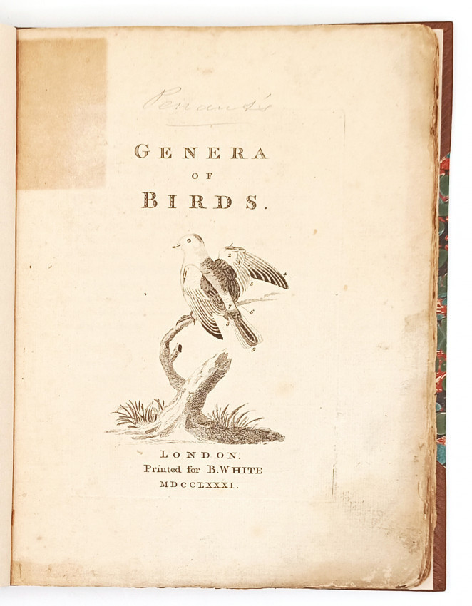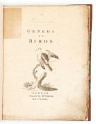 'The naturalist and traveller Thomas Pennant (1726–98) helped popularise British ornithology by meticulously compiling and arranging existing research. At the age of twelve, Pennant had been given Francis Willughby's Ornithology (1678), to which he credited his lifelong love of natural history. His own writings on ornithology are heavily based on the classification system devised by Willughby and John Ray, which divides birds primarily into land birds and waterfowl. Although Pennant's brief, accessible book brought few original insights to the field, it boosted public interest in the study and classification of birds. The detailed descriptions of the appearance and habits of each bird are enlivened by the author's elegant turns of phrase. This better-known 1781 version of the 1773 original includes fifteen fine engravings. Pennant's other zoological works include Arctic Zoology (1784–5) and his History of Quadrupeds (third edition, 1793).' Editor's note to the facsimile reprint published in paperback by Cambridge University Press, January 2014. (https://www.cambridge.org/za/universitypress/subjects/general-science/history-science/genera-birds?format=PB)