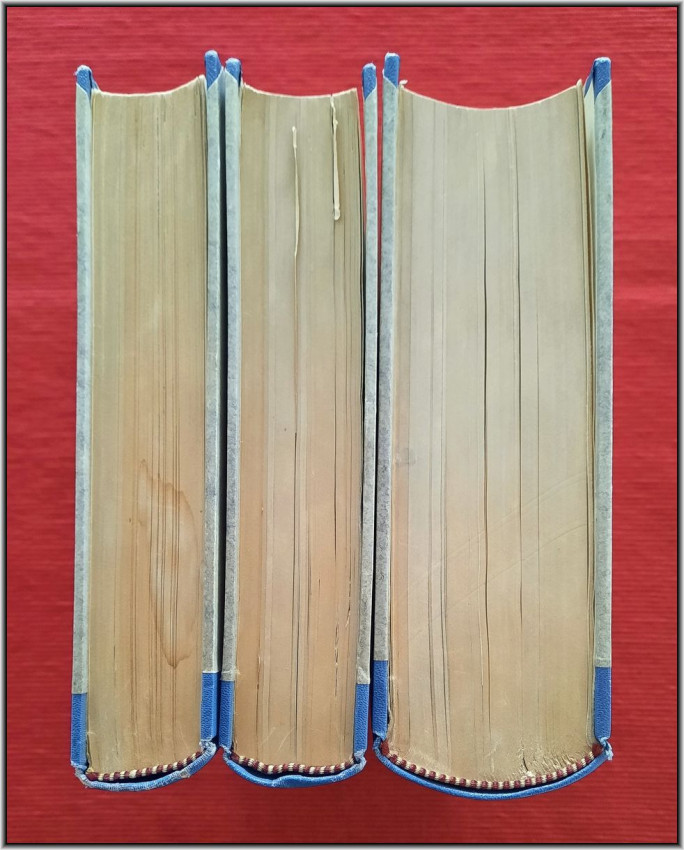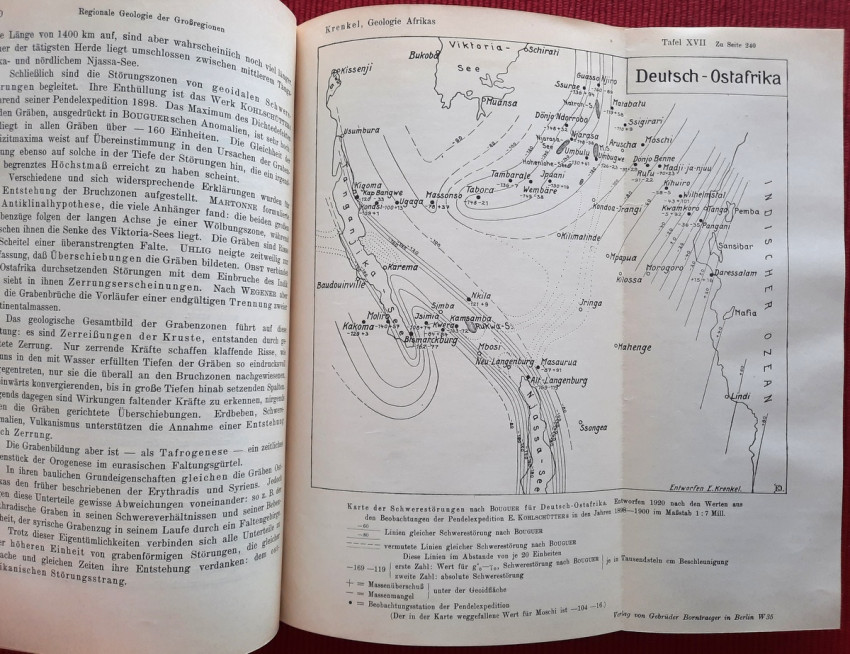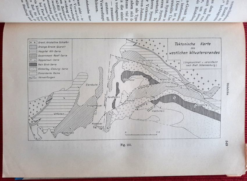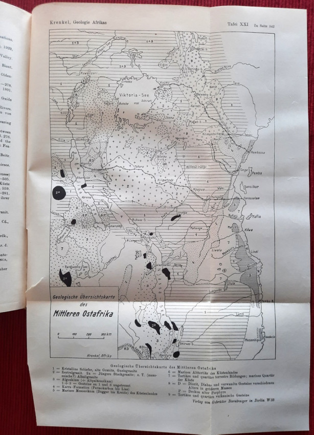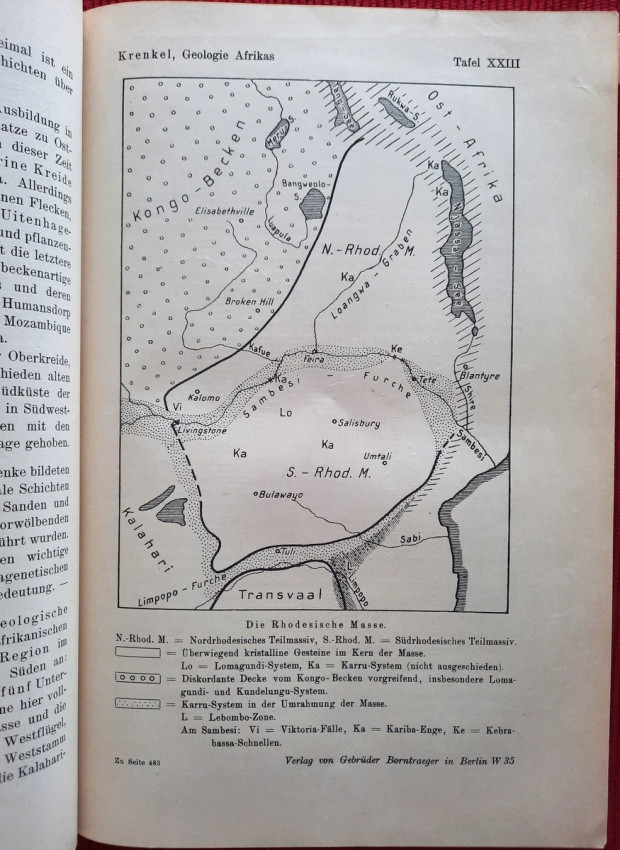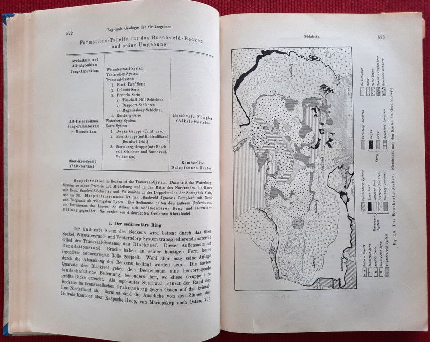 "Geologie Afrikas"; Harcovers; Text in German; Collation complete - Vol. 1 - Photograph frontispiece, Title page, X, pages 1-461, with 22 maps and plates (many folding), 105 in-text illustrations, maps, tables and sketches; Vol. 2 - Title page, XII, pages 463-1000, with 15 maps and plates (many folding), 125 in-text illustrations, maps, tables and sketches. Including large folding Geological Map of South Africa at the rear; Vol. 3 / Part 1: Title page, VIII, pages 1001-1304, with 10 maps and plates (many folding), 3 folding tables and 181 in-text illustrations, maps, tables and sketches; Vol. 3 / Part 2: Title page, VIII, pages 1305-1918, with 8 maps and plates (many folding), 3 folding tables and 131 in-text illustrations, maps, tables and sketches; Ex-library copy. Several Ex-library stamps throughout, otherwise the text block/pages are complete, bright and clean. Vol.1: Spine damaged at front joint (only at surface, binding not affected inside the spine cover). First and last free endpapers torn from the text block. Vol.2: First and last free endpapers torn from the text block, half-title starting loose (partly torn from from the text block). Ex-libris inscriptions with pen and pencil. A few pages dog-eared. Vol.3: Ex-libris inscriptions with pen and pencil. A rarely complete and sound copy. A heavy item (circa 5 kg).