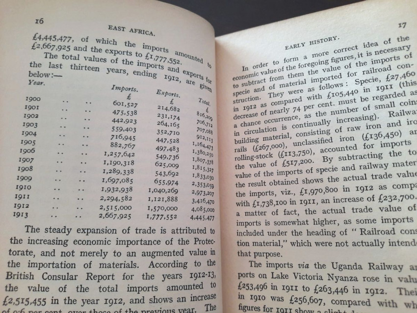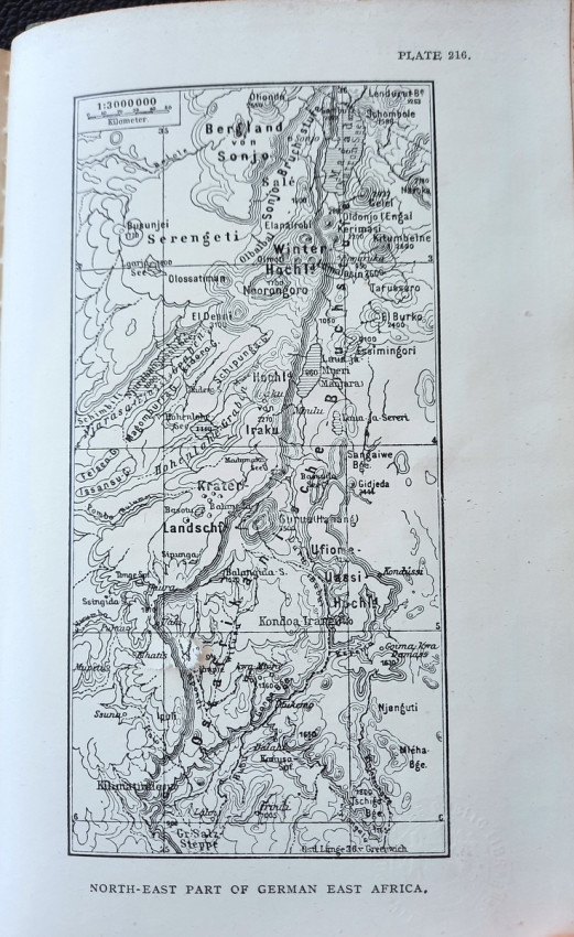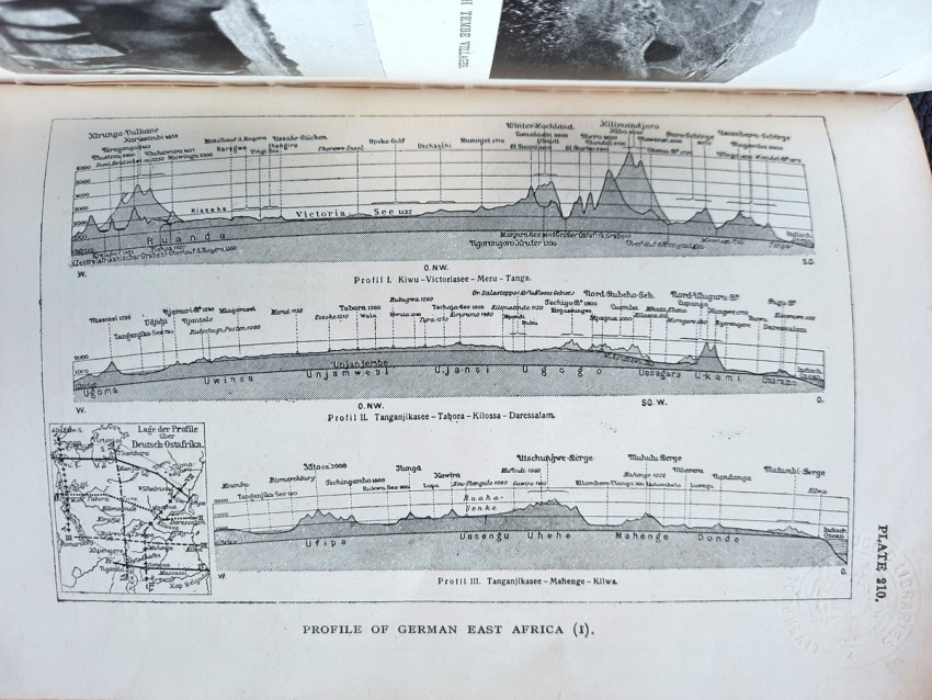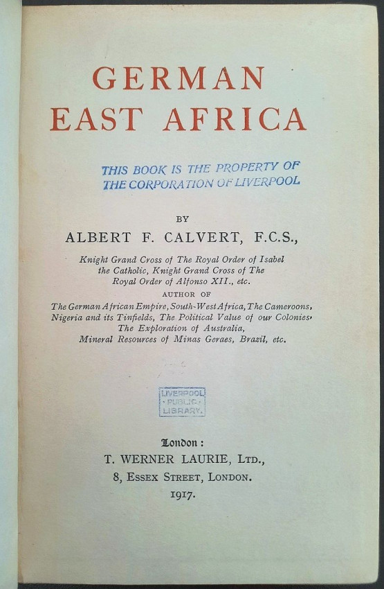 One of the most important reference sources on the German East Africa, a compendium compiled by Albert F. Calvert, gives a complete overview about German East Africa until 1917. This scarce work consists of nine chapters on 122 pages and 209 photographic plates on glossy paper at the rear (full page plates or two plates per page), 4 plates with profile diagrams and 6 maps. Includes many photos of native tribes and their chiefs, native women, hunting scenes, local life and tribe's customs, native and colonial settlements, plantation work scenes, etc.