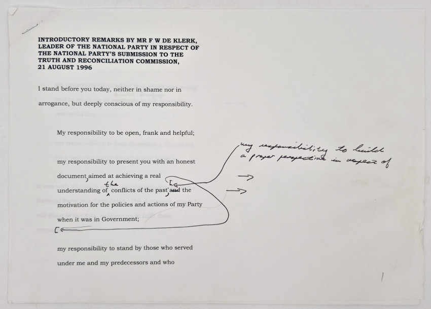 These materials document Mr. de Klerk's preparation for a rare public acknowledgment during the reconciliation process. As the last apartheid-era president and co-recipient of the 1993 Nobel Peace Prize with Nelson Mandela, his 1996 appearance remains a significant, if controversial, episode in transitional justice history. The TRC itself, established under the Promotion of National Unity and Reconciliation Act No. 34 of 1995, is widely regarded as a global model for post-conflict healing.