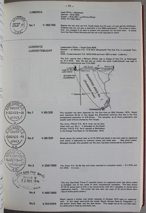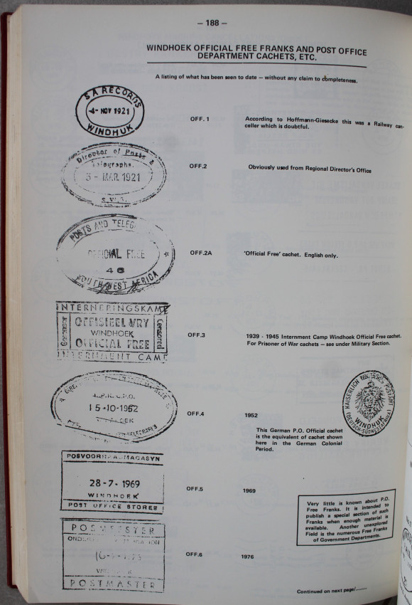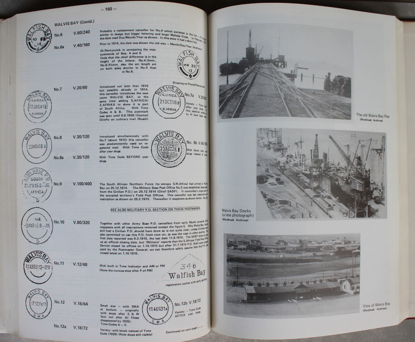 A Comprehensive Study. 1914 - 1977. Including a complete listing of all SWA Post Offices with special sections on South African Military Campaign Postmarks 1014-15, Railway Station Cancellations 1915 -1977, Telegraph Stations, Airmail history of SWA, Censor cachets, ships postmarks etc.