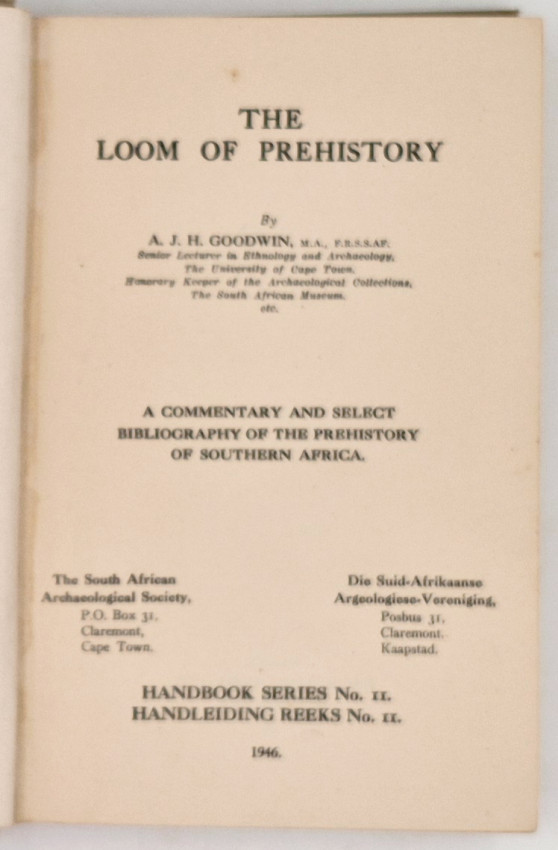 Goodwin (A.H.J.) The Loom of Prehistory. 151 pages, interleaved with blank pages for notes, grey cloth, presentation inscription from the author, grey cloth, First Edition, 1946
