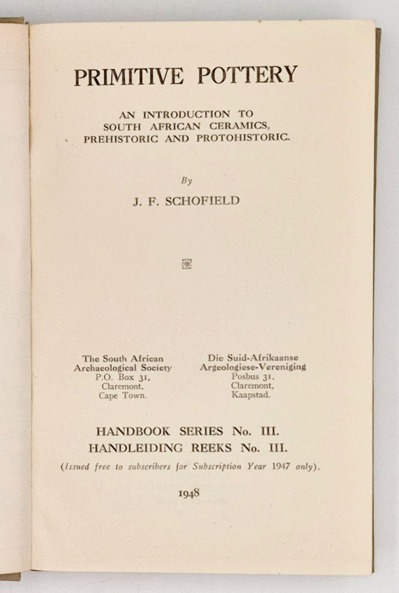 Schofield (J.F.) Primitive Pottery. 220 pages, maps on endpaper, illustration, grey cloth, a very good copy, 1848