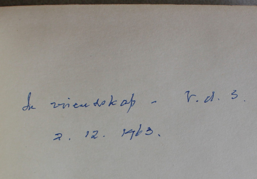 This copy is signed by the author on the title page. Again he inscribed on the ffep: In vriendskap, v.d.s, 2/12/1963. (V.d.s. meaning: van die skrywer)