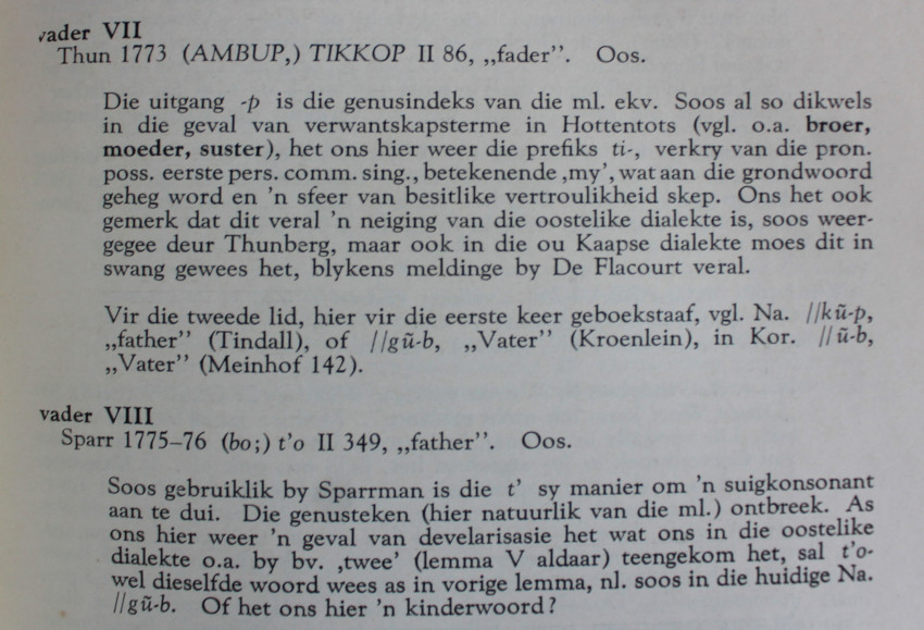 Contains a 338 page glossary (page 201-539) of Hottentot words where each entry is accompanied with a short linguistic analysis and a reference to the early explorers who recorded it.