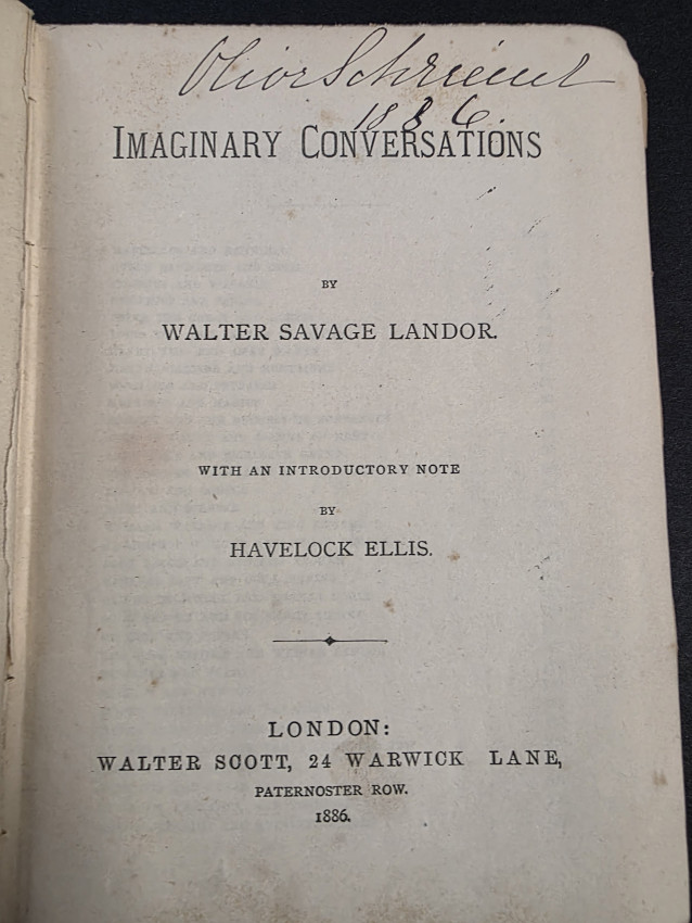 published during Schreiner’s peak years in England, contains her personal signature, a rare geographical inscription from Harrow-on-the-Hill, and extensive pencil marginalia that offers a direct window into her reading habits and her response to Ellis’s early editorial work. The title page bears the signature "Olive Schreiner 1886." A further inscription on the flyleaf reads: "Liked very much, the Convent Harrow-on-the-Hill June 1886." This was a transformative year for Schreiner, during which she was deeply embedded in the London socialist and literary avant-garde.