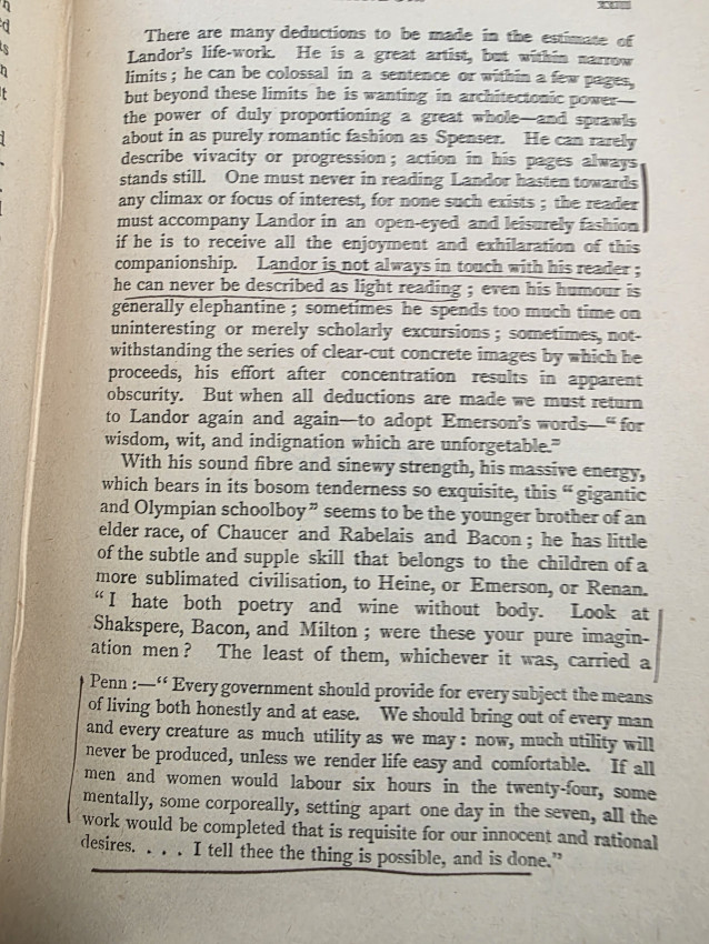 Literary Criticism: Multiple brackets within Ellis's introduction, highlighting passages where he discusses Landor’s "absolute vision" and "elephantine" humour.