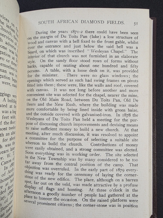 An interesting account by the author of The Eastern Province Annual and In Afrikander Land. Angove's work focuses on the discovery of diamonds in Kimberley. Although much of it is anecdotal, Angove devotes a large part of his account to the establishment of infrastructure to accommodate the influx of people. (Source: Hosken, p7)
